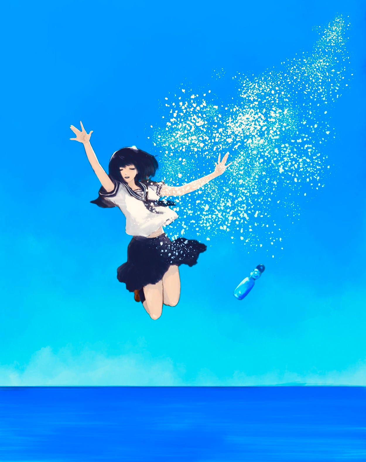 こちらの作品は大学4回生時に制作した作品になります。No.7の作品と同様に島根県の海をモデルに描いた作品になります。シュワッとしたラムネが真夏の昼間に飲みたくなるような絵を目指しました。もう少し海の海面や空を描いても良かったと考えることのある作品です。2019,3作成。
