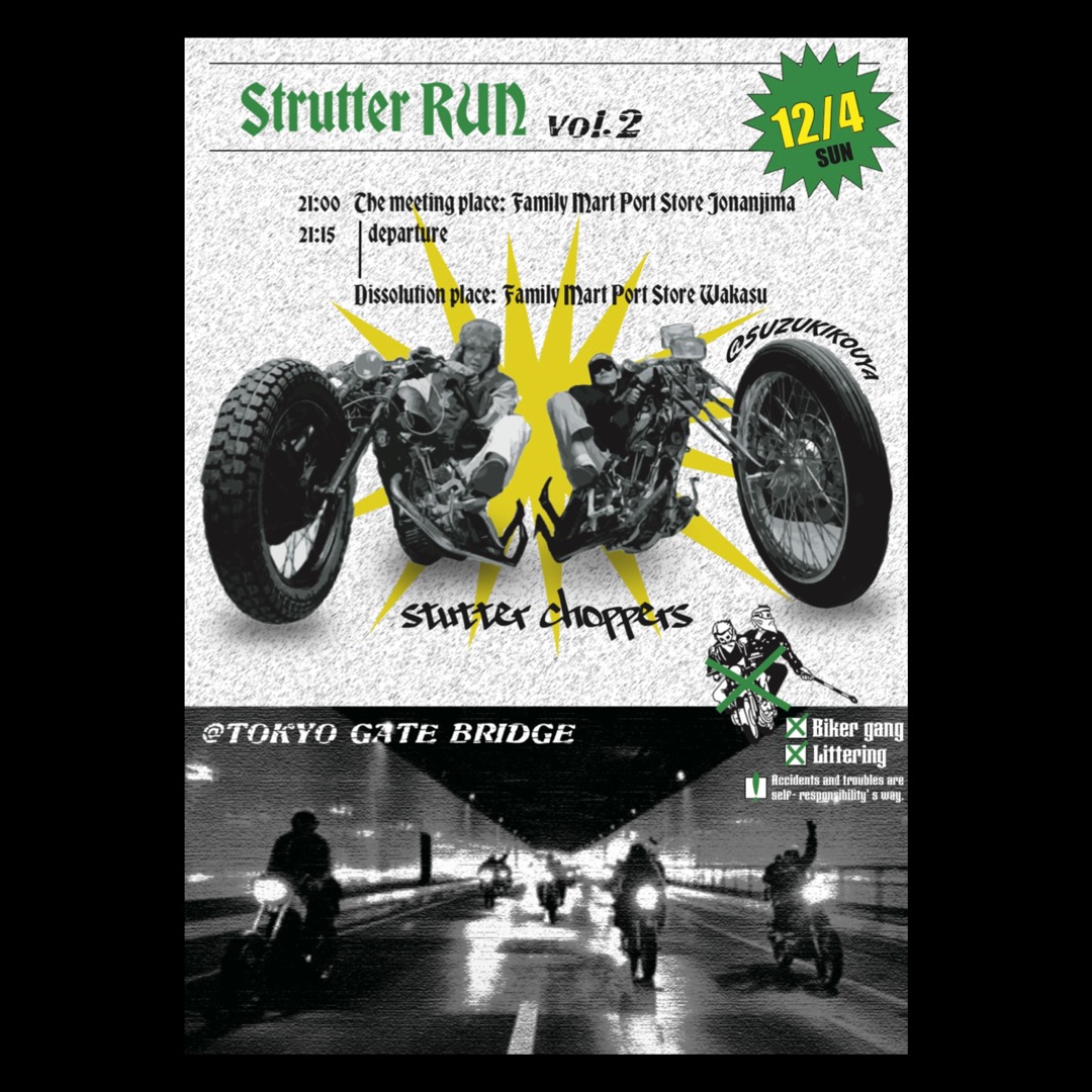バイクイベント「Strutter Run vol.2」の告知ポスターを制作。 イベントのカルチャー性とスピード感を活かしながら、参加者に必要な情報を明確に伝えるデザインを行った。
