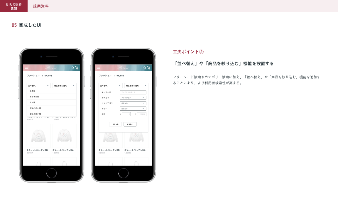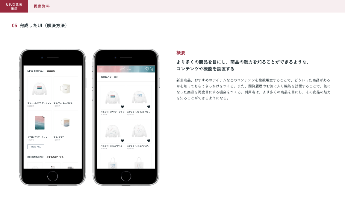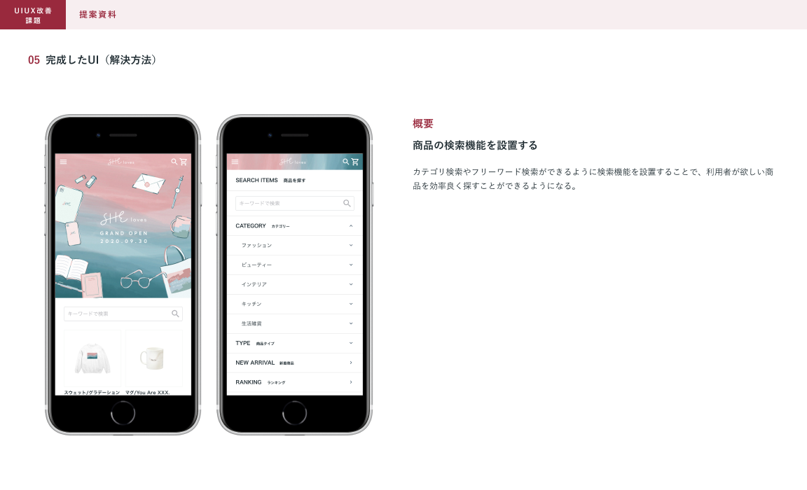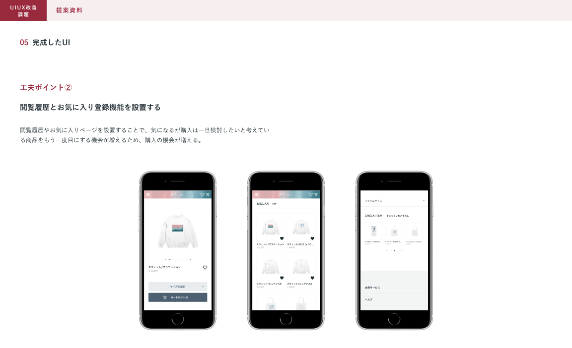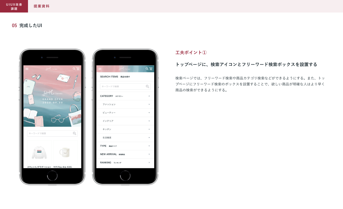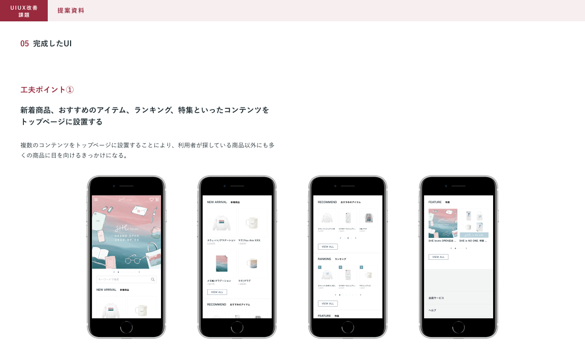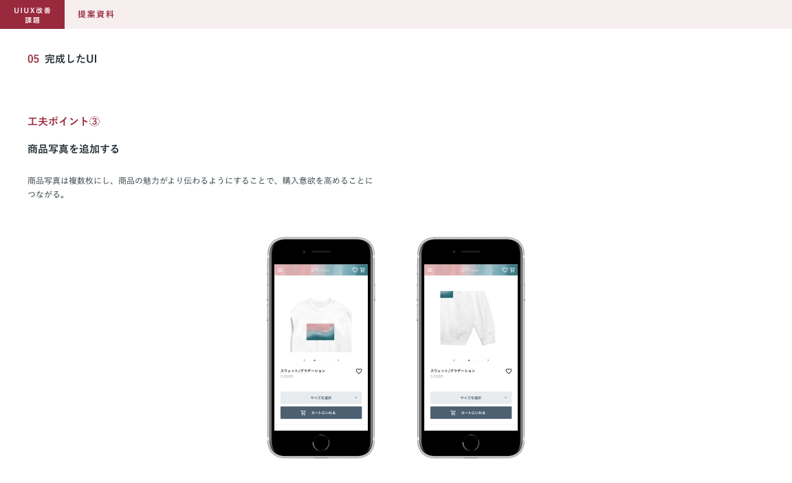 SHElikes MULTI CREATOR COURSEの課題で、架空ECサイトのUIUX改善に取り組みました。架空のクライアントからの依頼書とECサイトのデザインデータを元に、UIUX改善の提案資料を制作しました。(制作時間:約15時間)