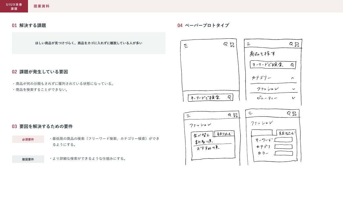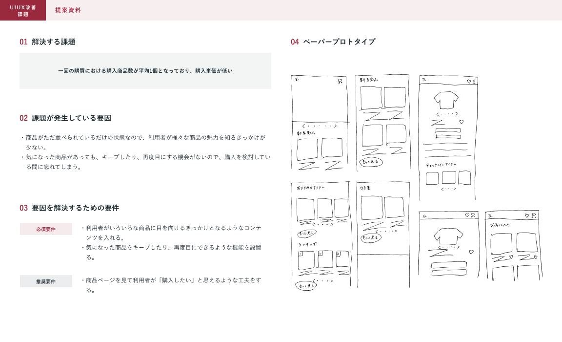 ■架空クライアントからの依頼:ECサイトの運営を始めたため、さらに売り上げを伸ばすためにUI/UX改善に取り組みたい。共有する課題感に対して解決案を提案してほしい。