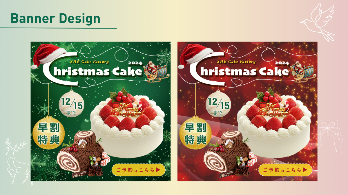 - クリスマスカラー(赤、緑、ゴールド、白)を基調