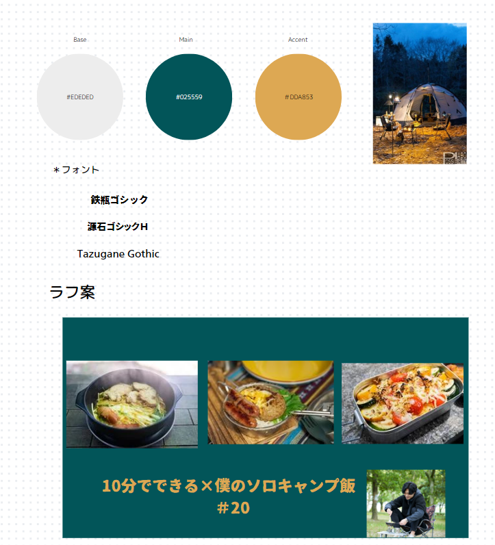 ・ペルソナの思考として「同じようにソロキャンプに関心がある方が、どんなキャンプ用品を使って、どんな食事を食べ、 どんな景色を見ているのか、自身のソロキャンプでのレパートリーを増やすために参考にしたい。」要望があると仮定し、 サムネイルからキャンプのグッズや雰囲気が伝わる写真を使用。