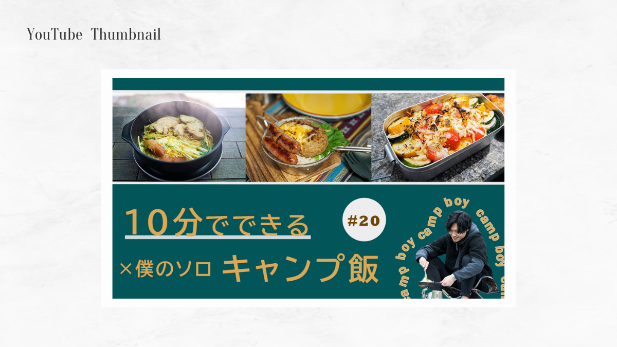 男性向けソロキャンプの魅力が伝わるサムネイルを作成し、アウトドアに関心があるユーザーに視聴してもらう。 再生数が伸びるようなキャッチ-なデザインで、新規の視聴者さんも獲得する。
