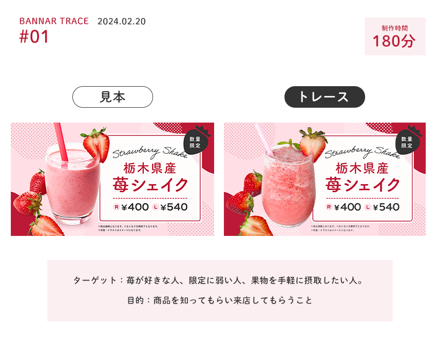 SHElikes MULTI CREATOR COURSE Designerにてバナートレース課題に取り組み、バナーを観察しターゲット・目的・配色・観察と分析をまとめました。 使用ツール:Photoshop 制作時間:180分