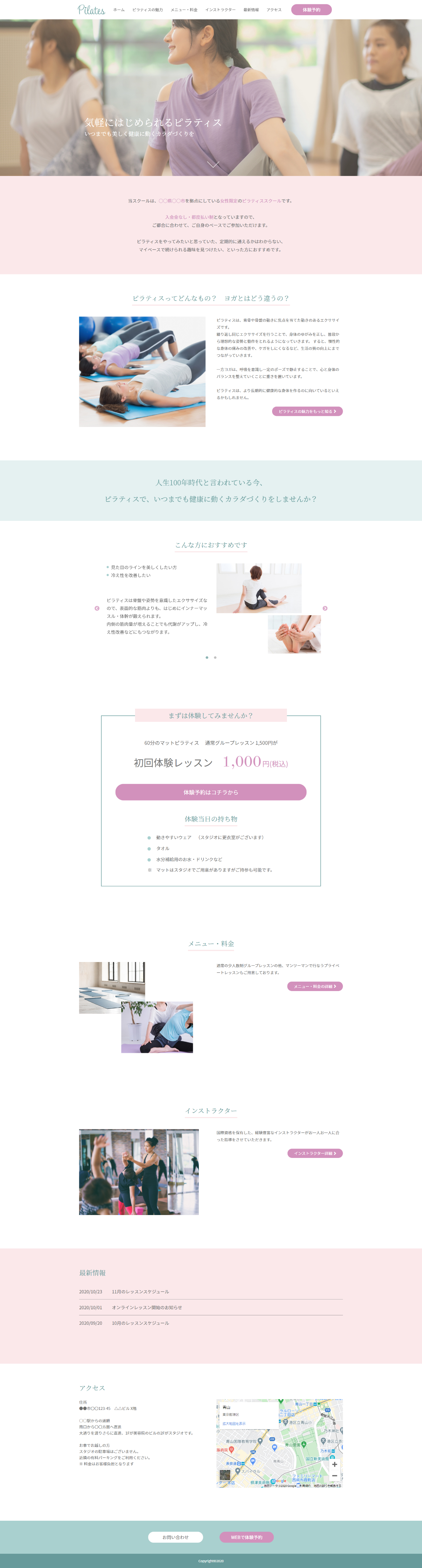 サイトの目的:ピラティスに興味を持ってもらい、スクールの体験予約をしてもらう