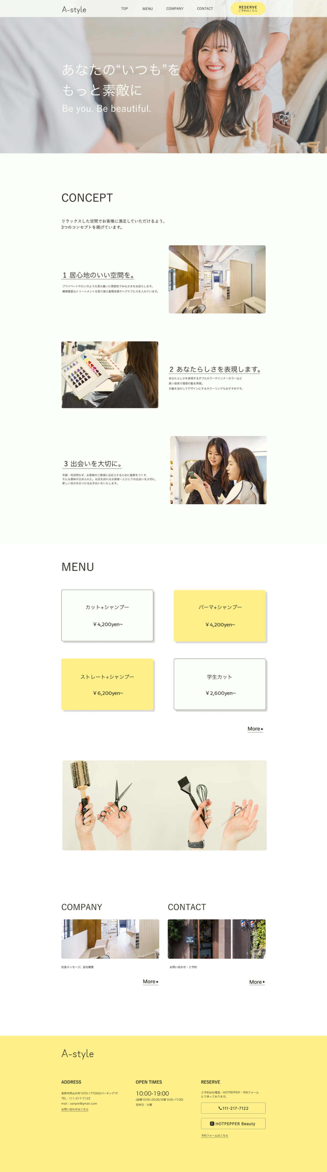 1stビューはコンセプトの「あなたらしさ」や「新しい自分を見つける」を元にキャッチコピーとサブコピーを考えました。人を前面に出して欲しいとのことで笑顔で満足している女性の写真を選びました。予約のしやすい形がいいということでヘッダーとフッターにRESERVEボタンを設置し、どのページに行っても予約フォームへつながるようサイトの動きを想定しながらデザインしました。
