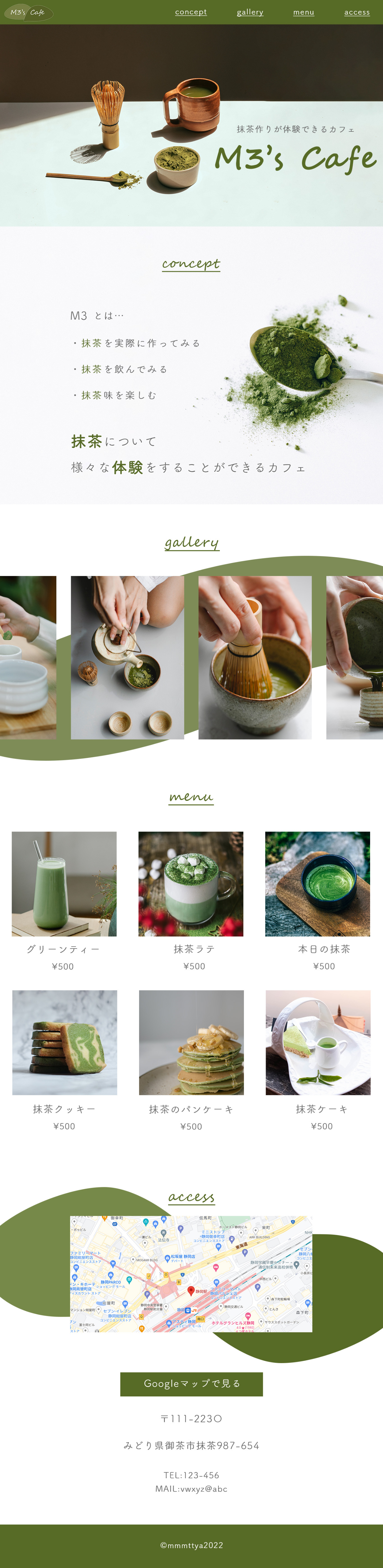 ・3つの体験ができるということを楽しく知ってもらえるため、抹茶の写真を多めに配置しました。