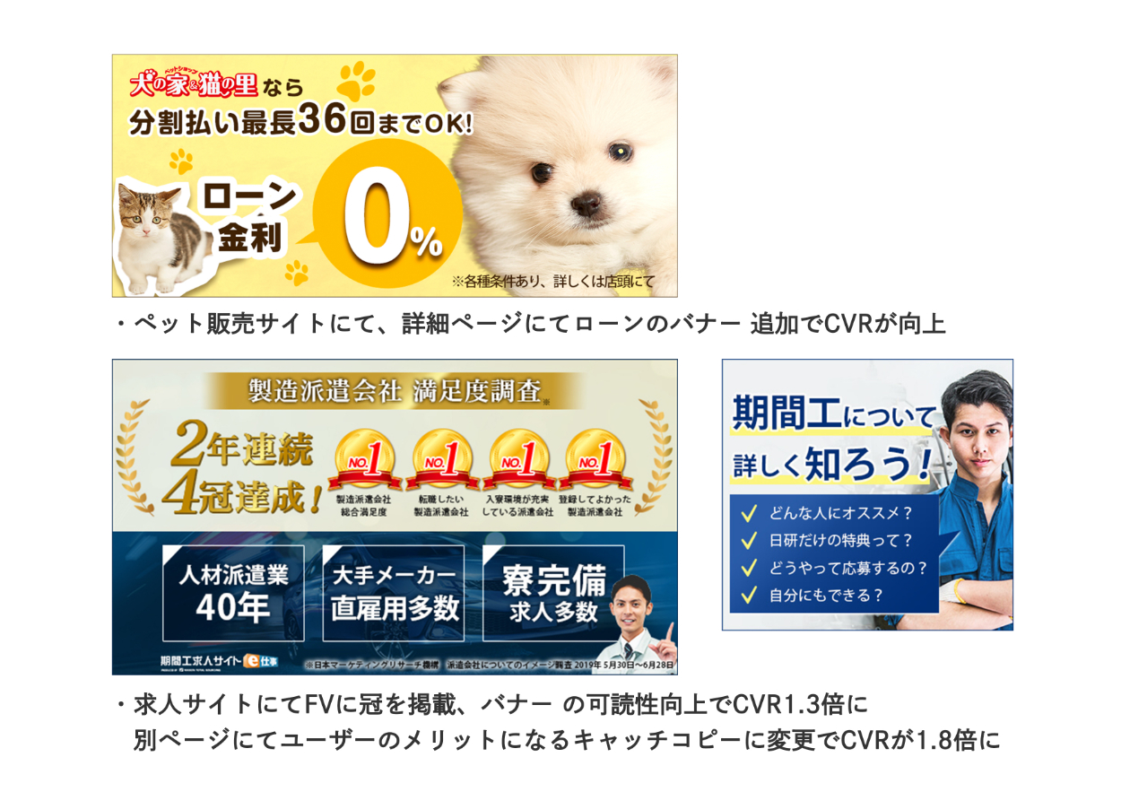 A/Bテストにおける、サイト分析〜改善立案〜改善案デザイン制作〜Googleオプティマイズ設定〜A/Bテスト実行〜結果分析〜考察〜効果の良いパターンの実装まで一貫して担当しております。 テスト案ではCVRがオリジナルの1.8倍となったケースもあり、多数の効果を上げております。