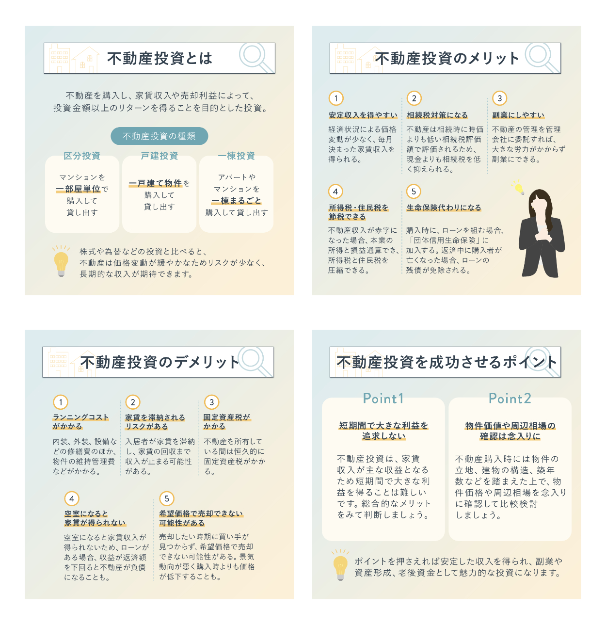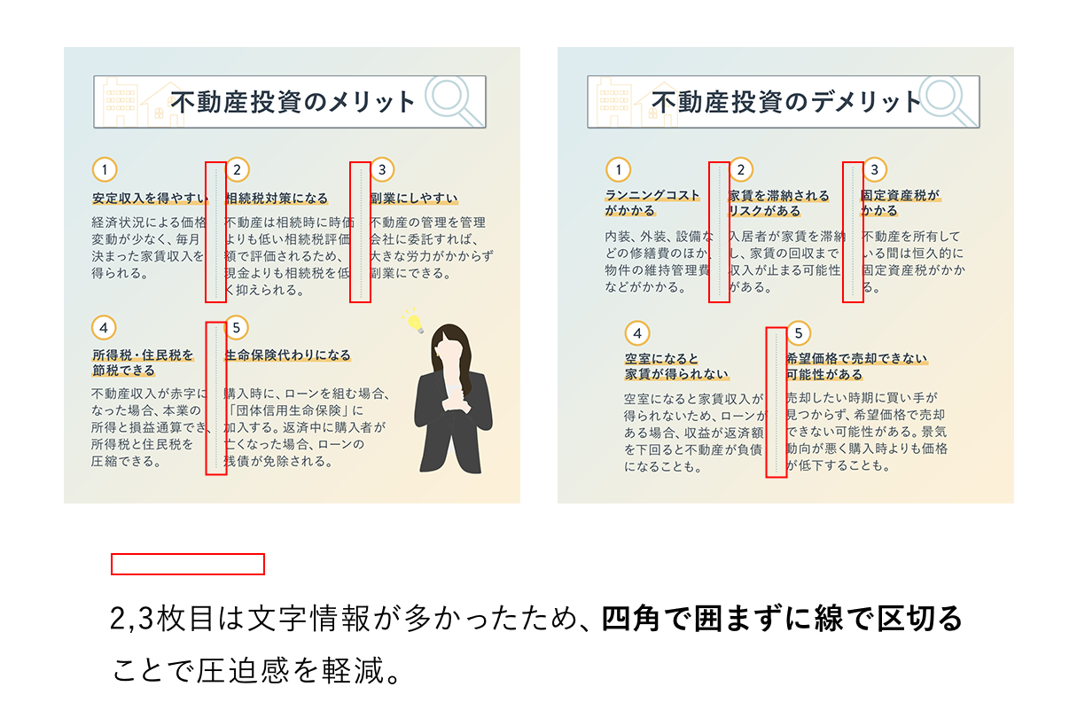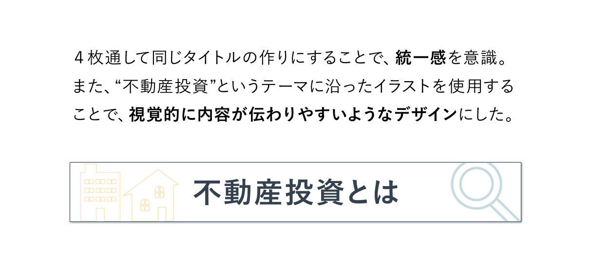 全体的に余白を取る、揃えることを意識して視覚的に見やすい、読みやすいを意識して作成。"不動産投資"というテーマなのでポップにはしすぎず、且つ堅苦しくなりすぎないようにターゲット女性に刺さりそうな配色やイラスト選びをした。