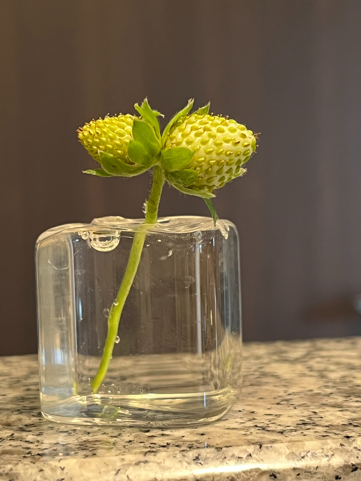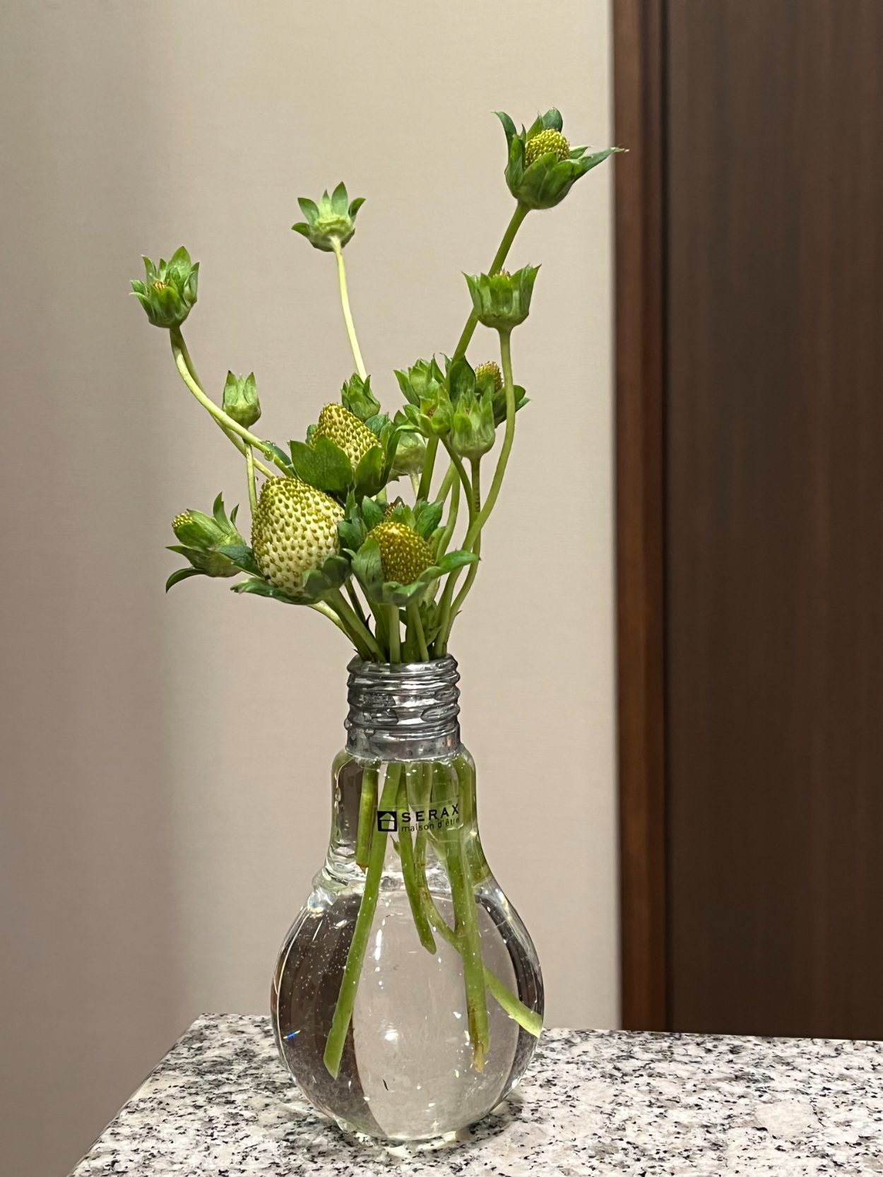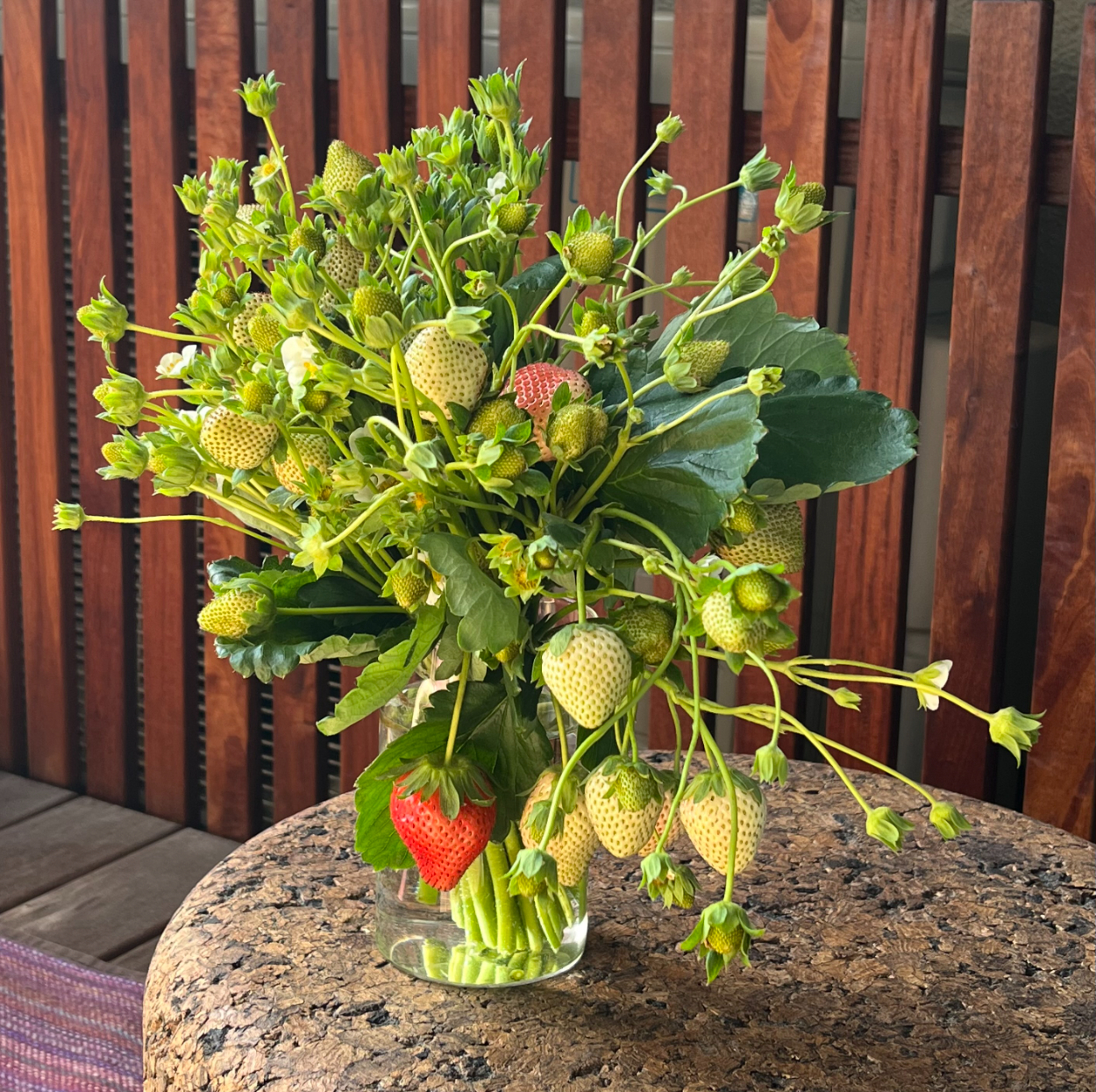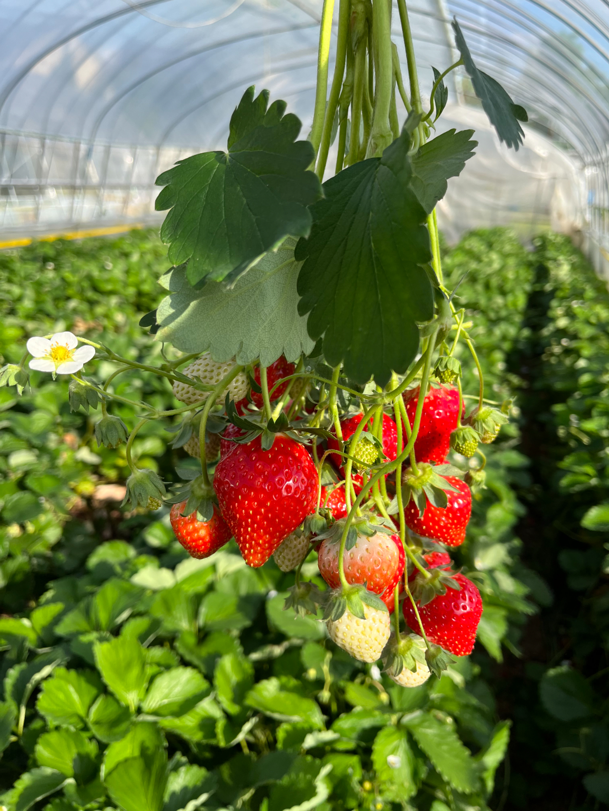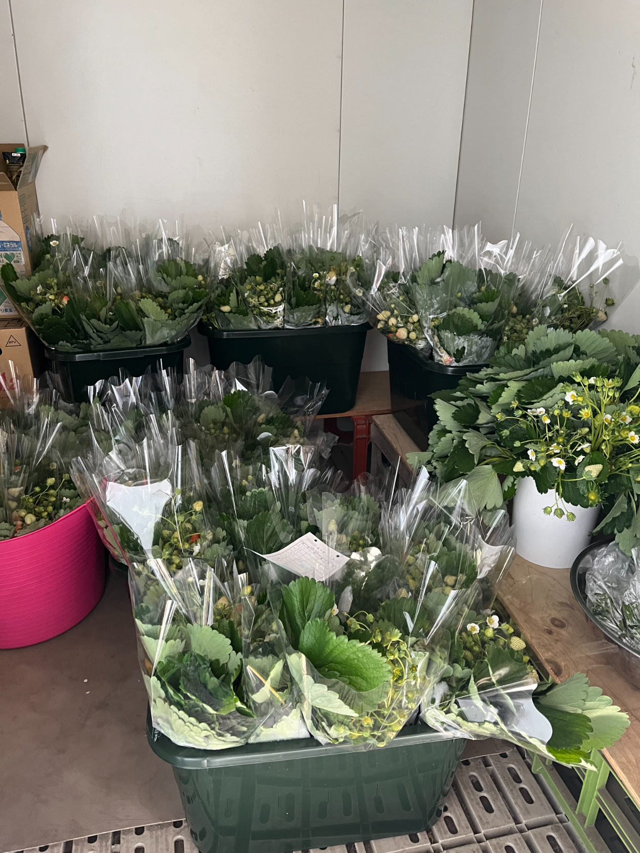 いちごの収穫終了時期に、いちごの花とまだ青い実を花市場に卸し流通することを実現。 捨てられていた農作物を違うカタチで価値に変える。