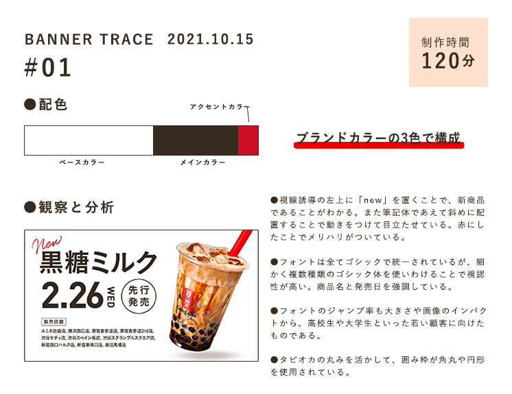 具体的にはカラーで派手さを打ち出すよりも、真っ白なアートボードに同じゴシック体を用い、文字や数字のジャンプ率をつけることで視認性を高めている。さらには文字サイズが小さくても視線誘導の始点に「new」に唯一の赤でメリハリをつけ、筆記体で動きをつけている点に、細かな工夫を感じました。バナーと一括りで言っても、文字が多い場合もあれば、反対にイメージが多くを占めることもある。ただ共通していることは、ユーザーの目に留まるための工夫が敷き詰められている。