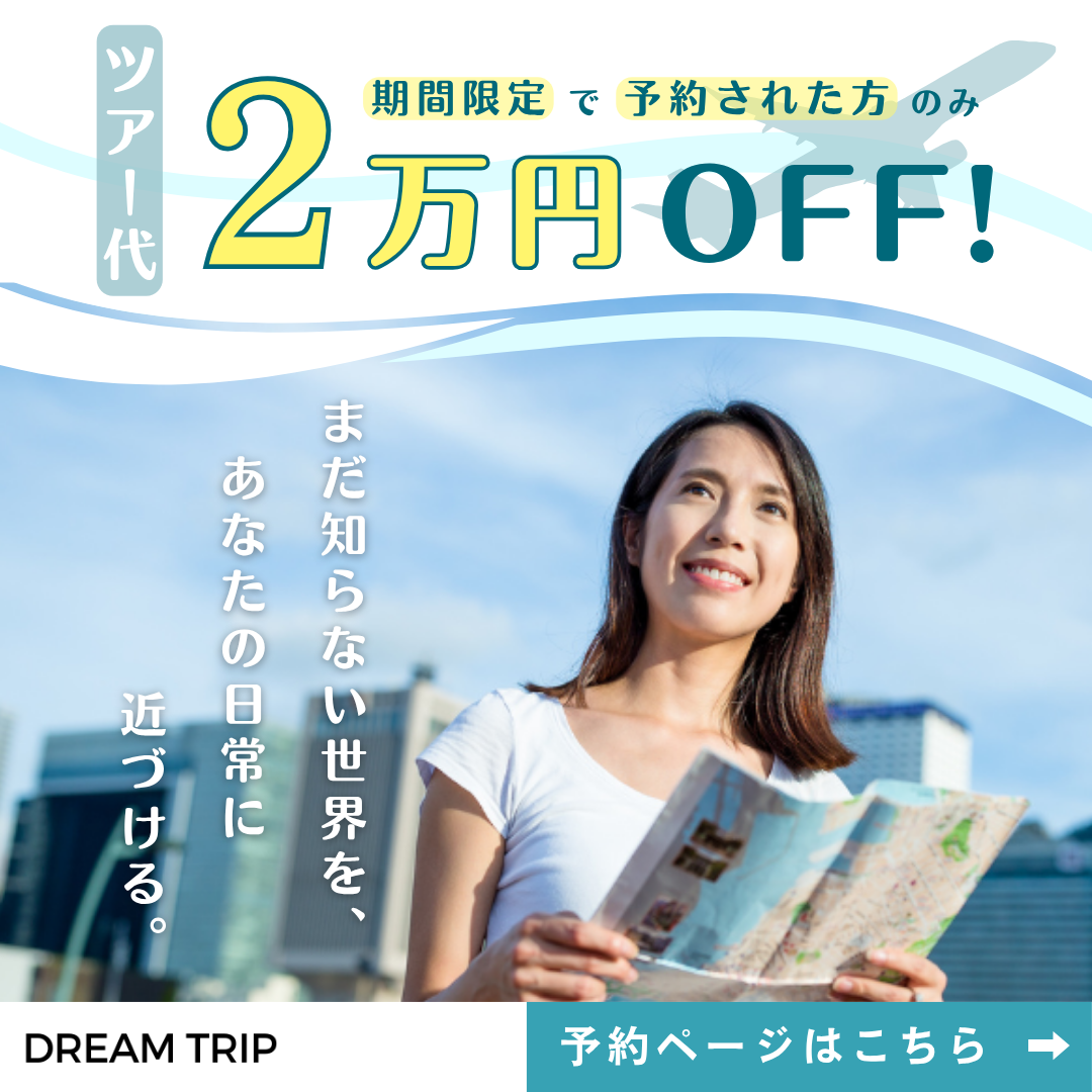 →「ツアー代が今だけ2万円OFF」:予約ページから期間限定で予約された方のみ、ツアーにかかる費用の総額から2万円OFFとなるキャンペーン
