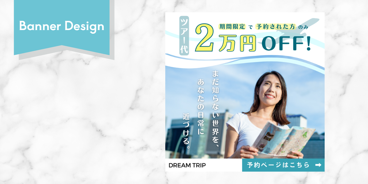 ・バナー上部に淡い色の曲線と飛行機をあしらい、初めての海外旅行でも軽やかに行動できるような明るさと、旅での新しい発見へのワクワク感を表現しました。