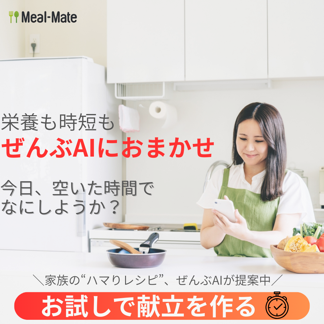 AIが提案するパーソナライズ献立アプリ「Meal-Mate」の広告デザイン。