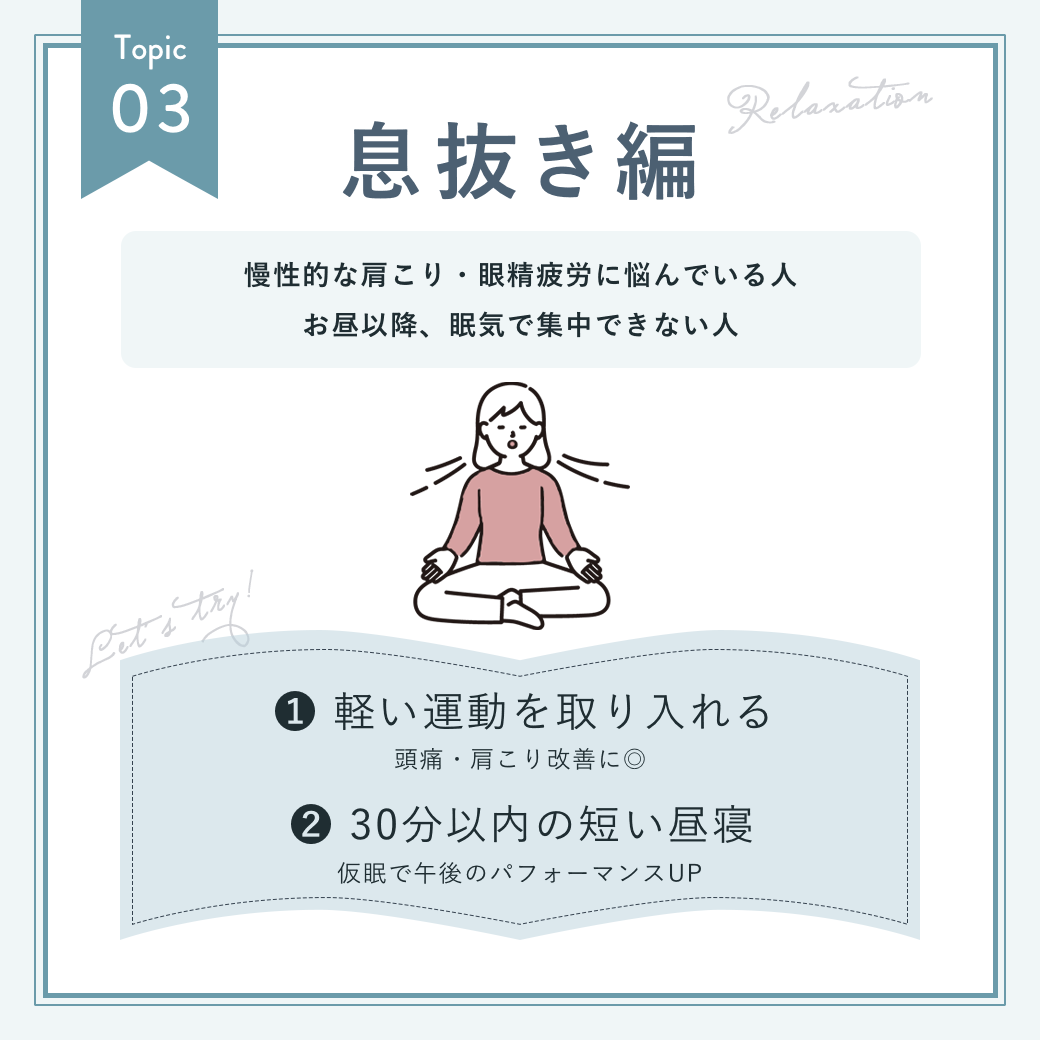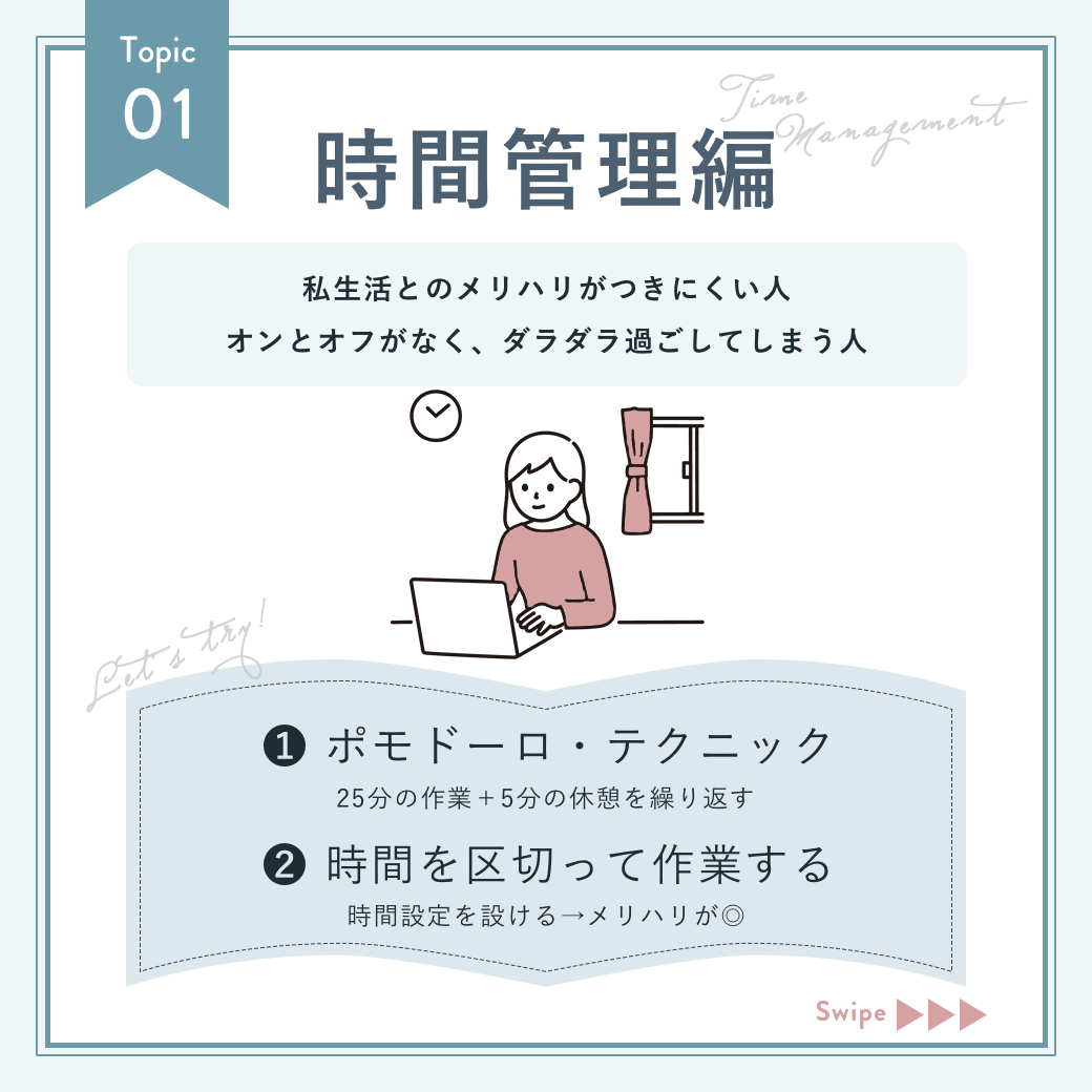 ・見る側がわかりやすく、3つのテーマ【時間管理編】【デスク環境編】【息抜き編】に分けて紹介しました。