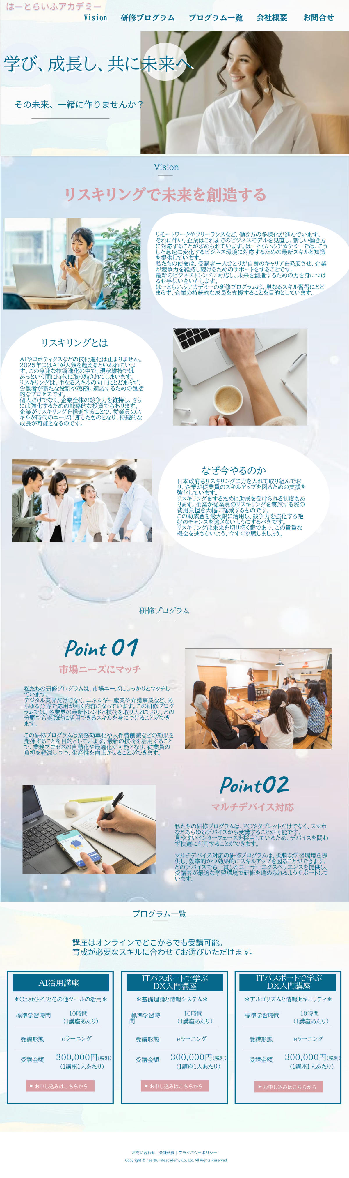 はーとらいふアカデミー(架空)LP ゆったん webデザイナー OVERVIEW IT系セミナーのLPを作成いたしました YEAR 2025 ターゲット層として、20代から30代のフリーランスを目指している女性を設定いたしました。女性を意識した色使いをすることで、ITにも興味を持っていただけるよう工夫いたしました。