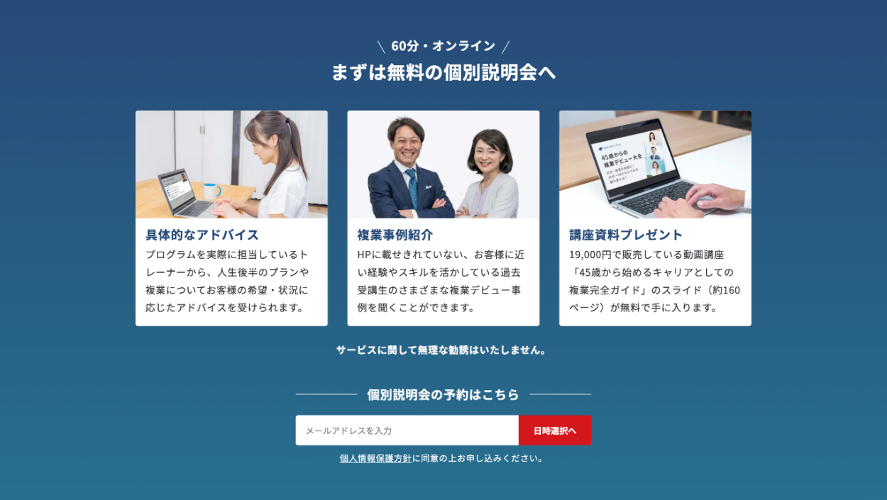 - 「個別説明会で何をするのか分からなくて不安...」という気持ちを解消するため、CTAセクション内にイメージ画像付きで説明会の内容を記載しました。