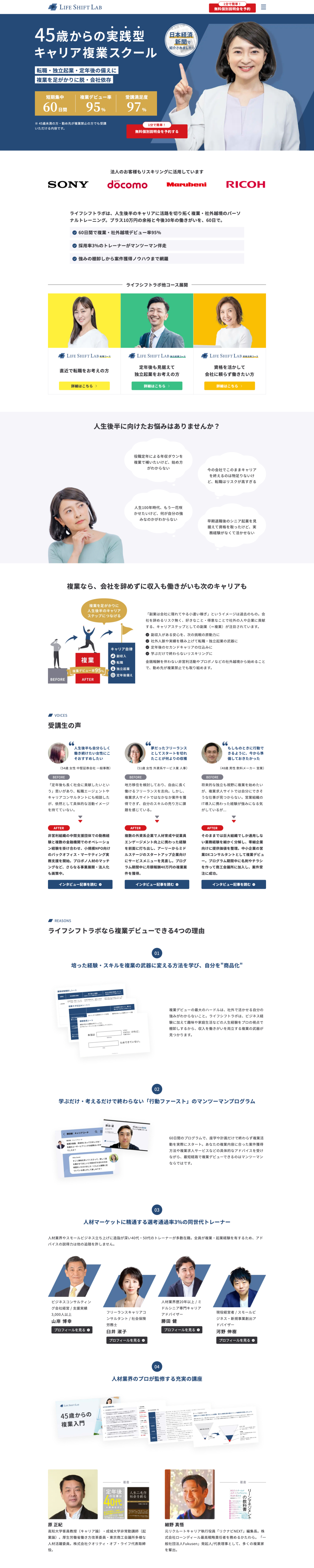 45歳以上の方をターゲットにした、実践型キャリア複業スクール「ライフシフトラボ」のLPデザインを担当しました。より多くの方へ届けるため、ユーザー様のお声を元に随時ブラッシュアップをしています。