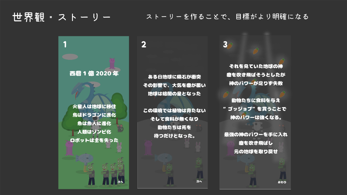 宣伝広告をする際に見た人の気を引けると思い、1億年後という少しぶっ飛んだストーリーにしました。