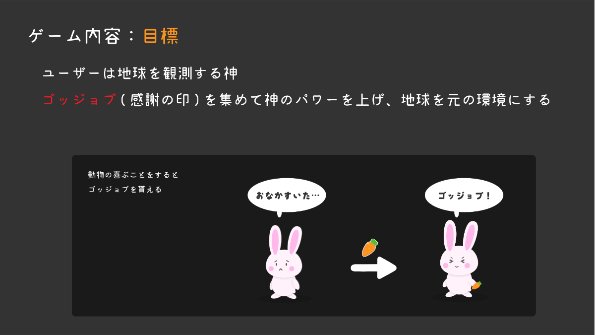 ゲームの舞台は今から1億年後の隕石の落ちた地球、プレイヤーは地球を観測する神。隕石衝突の影響で食料が無くなり、動物たちはみな腹をすかせている。そこで神(プレイヤー)が動物たちに食料を与え、感謝の印である”ゴッジョブ”を貰う。ゴッジョブを集めて神のパワーを強くし、元の食料が豊かな地球に戻すというストーリー。