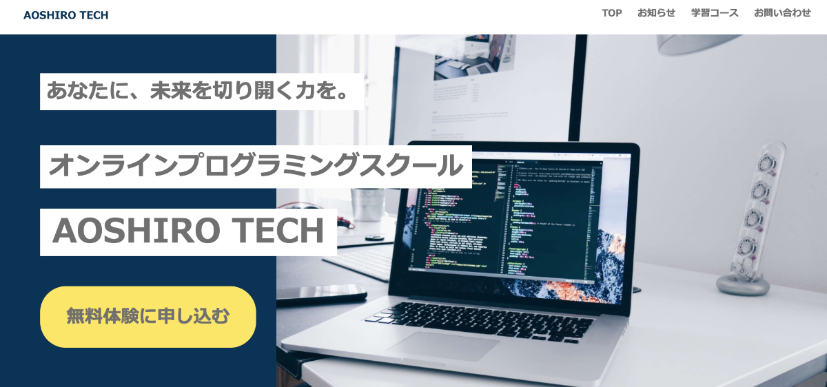 プログラミングスクールのHP 鈴木康平@あおしろ フリーランスWEBデザイナー OVERVIEW 練習制作物 YEAR 2021 練習の制作物として作成しました。プログラミングスクールのHPをイメージ。https://portfolio.aoshiroworks.com/ WEBSITE