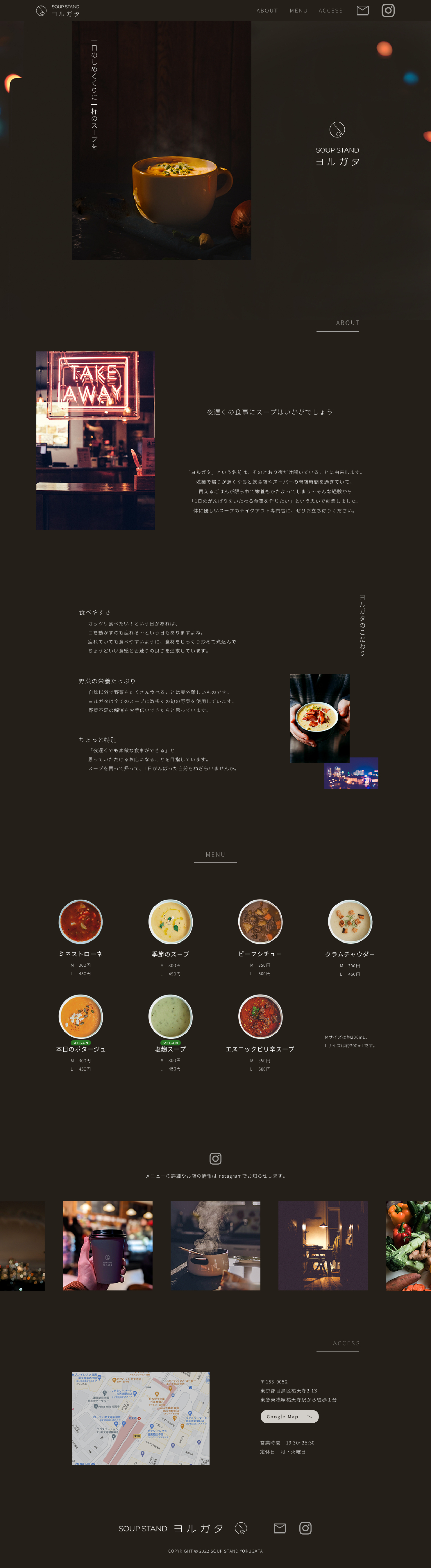 夜遅くに帰宅する人のために夜だけ開いているスープスタンドを想定してWEBサイト制作を行いました。
