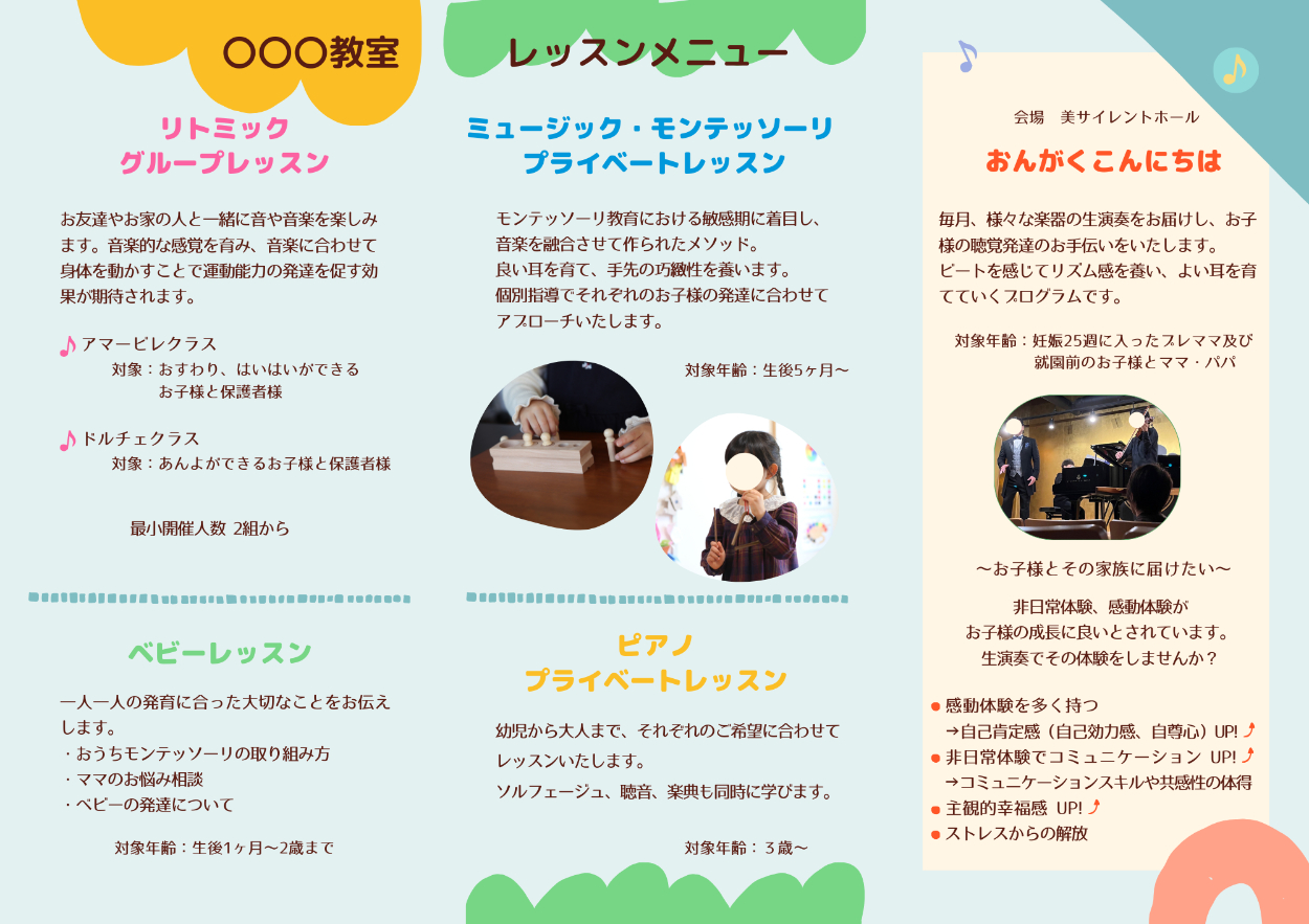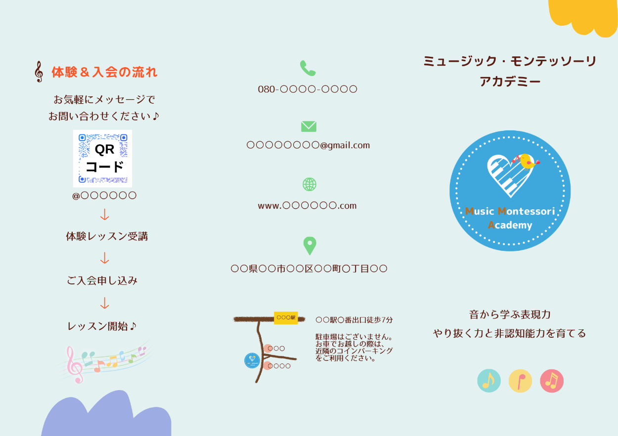 【実案件】三つ折りパンフレット sn1191 Webデザイン・グラフィックデザイン勉強中 OVERVIEW 音楽とモンテッソーリを学べる教室の案内パンフレットを制作させていただきました。 YEAR 2023 【制作物】A4サイズの三つ折りパンフレットCanva使用※個人が特定できる情報は依頼者の希望により伏せてあります。見た時にわくわくできるような色やフォントを使用しました。