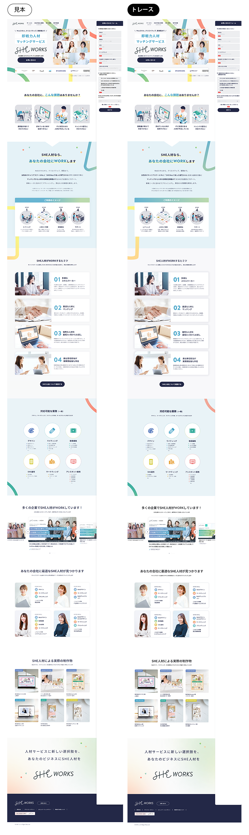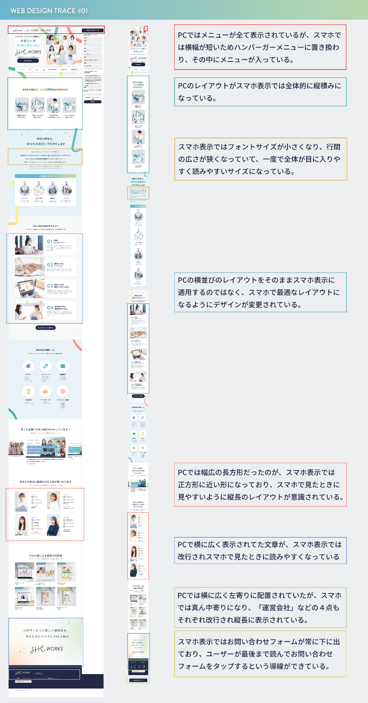 SHElikes MULTI CREATOR COURSEにて、WEBページトレース課題に取り組みました。デザインガイドラインの作成と、PCとスマホで異なるデザインやレイアウトの分析を行い、分析結果をまとめました。