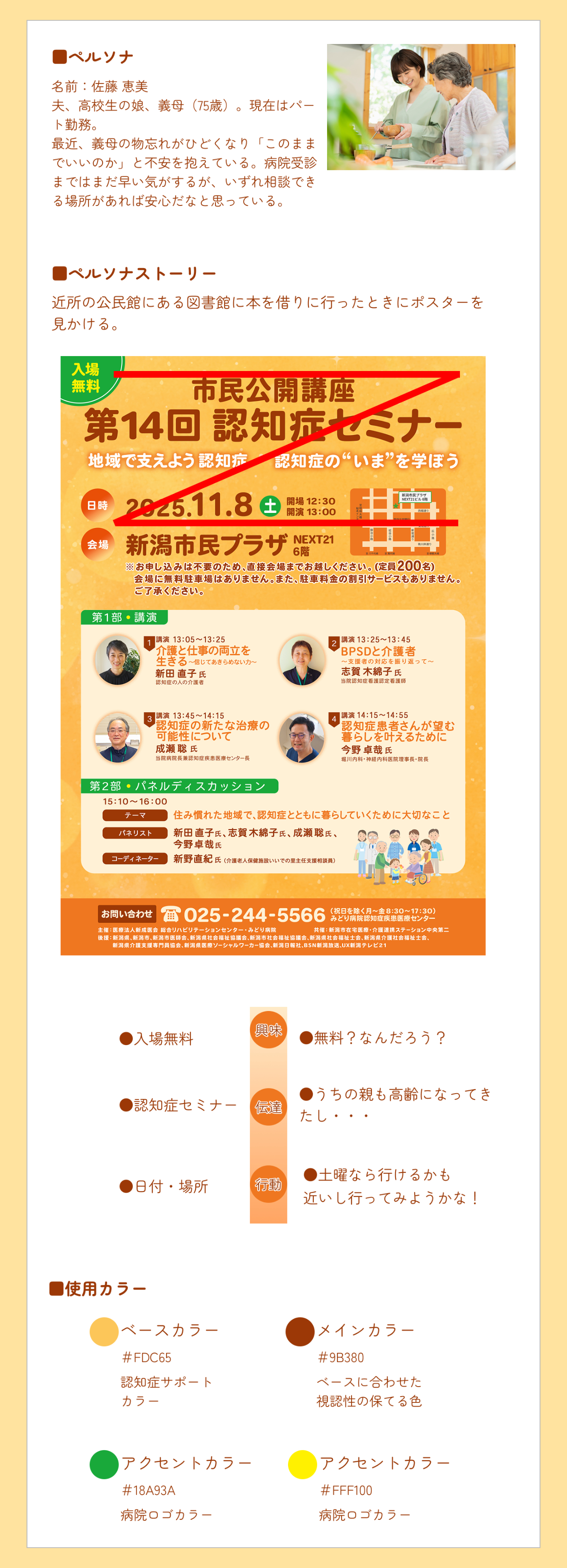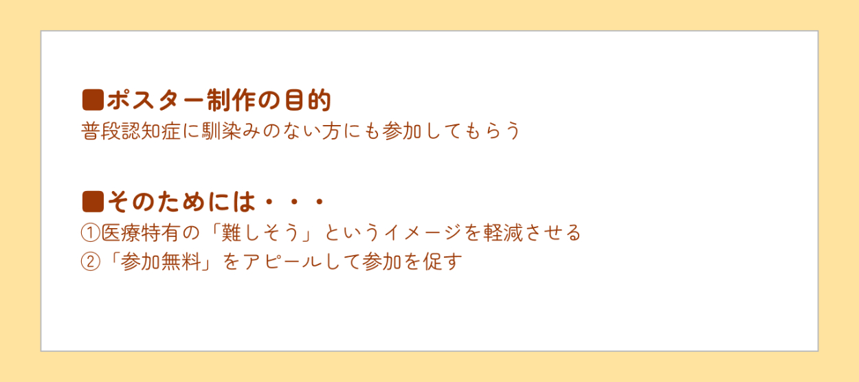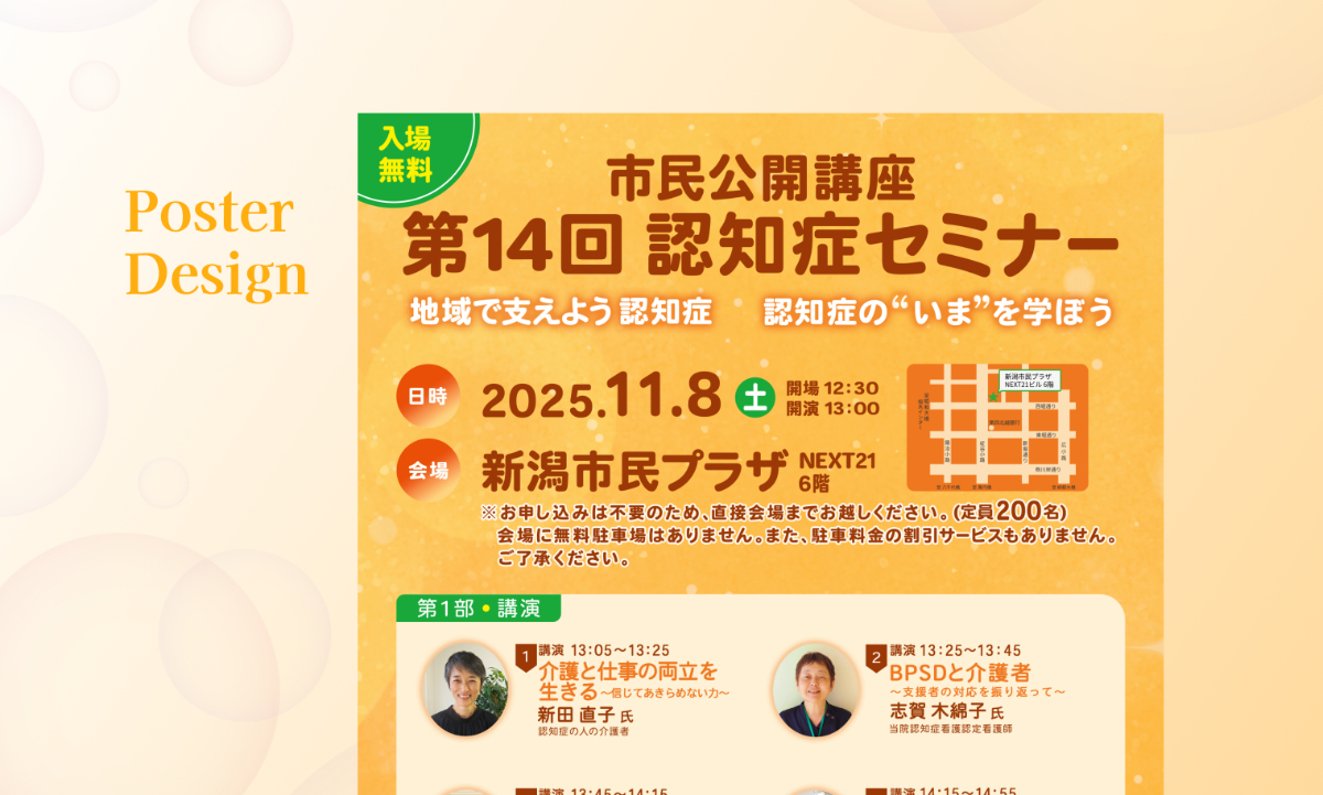 ●「病院」「認知症」という少し難しいイメージを和らげるため優しい雰囲気のイラスト、背景にはシャボン玉のイラストを使用して柔らかさを表現。