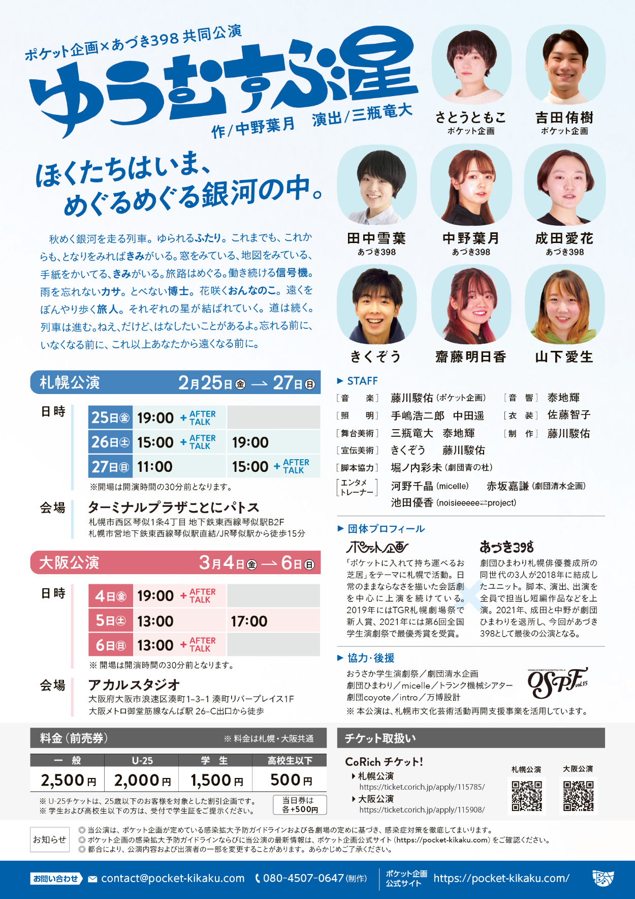 ポケット企画×あづき398『ゆうむすぶ星』 藤川駿佑 デザイナー OVERVIEW 札幌の2劇団がコラボする公演『ゆうむすぶ星』のフライヤーを制作しました。開催地域の小劇場を中心に2000部ほど配布されました。 YEAR 2022 Special Thanksメインビジュアル/ロゴ きくぞう