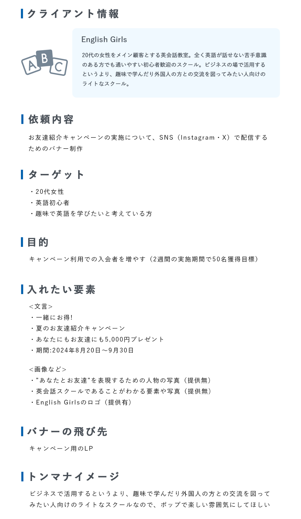 SHElikes MULTI CREATOR COURSE Designerにて、架空のクライアントからの依頼内容をもとに、キャンペーンバナー制作の課題に取り組みました。