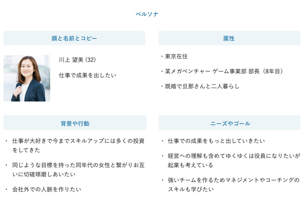 女性向けのビジネススクールを展開。会員は20~30代の女性が多く、キャリアアップのためにビジネススキルを学び、さらにそのアウトプットの場として定期的にビジネスコンテストなどのイベントも開催されている。