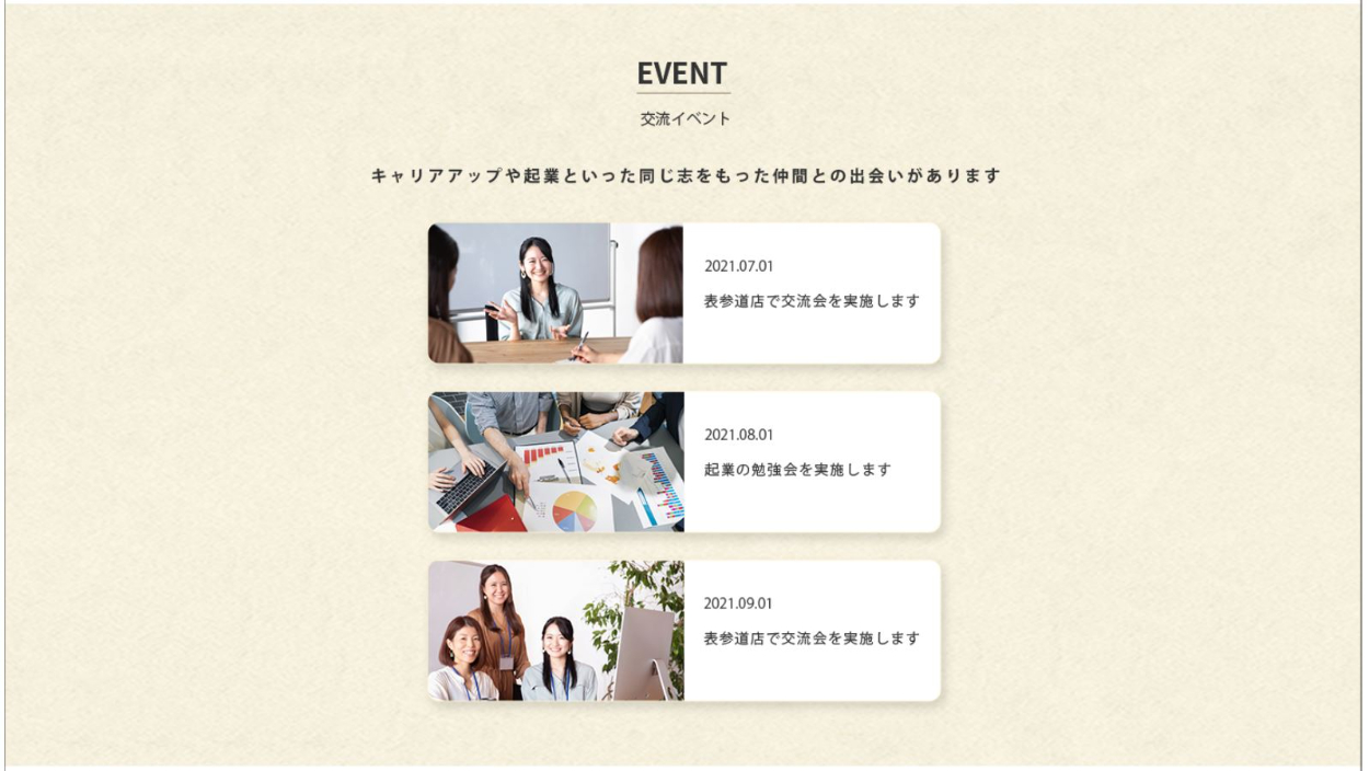 起業やキャリアップの目標をもつ女性が交流できる場ということも、WORK lounge Aoyamaの特徴と捉えたので、「交流イベント」のセクションを作りました。