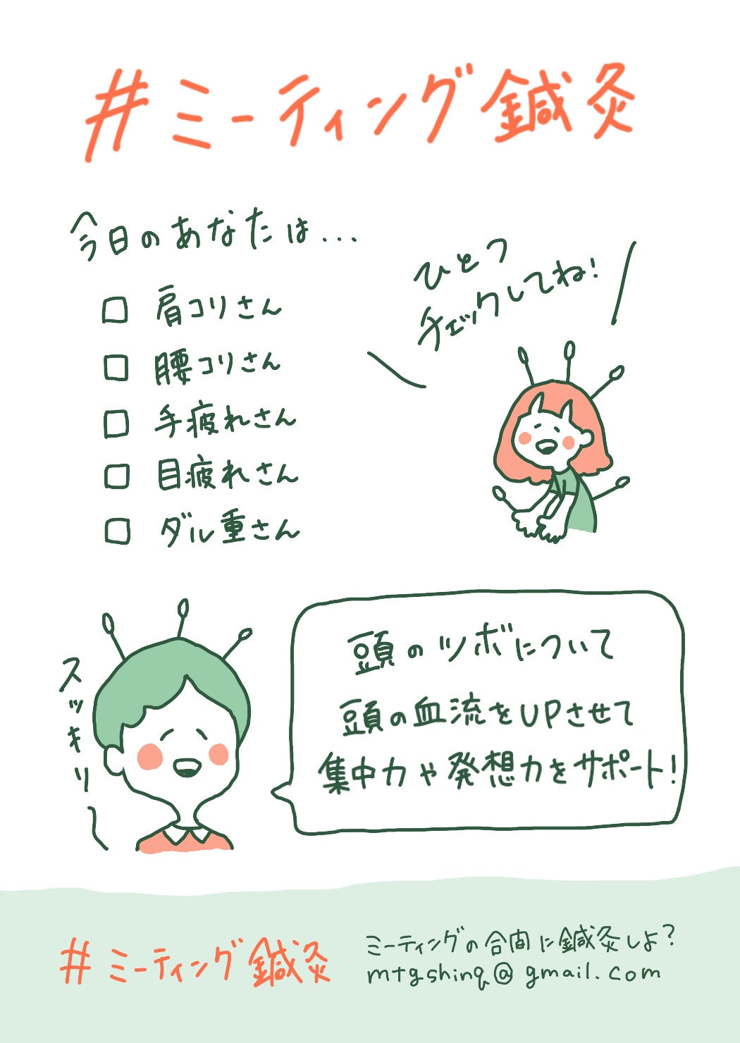 ミーティング鍼灸 Hinako Asanuma (nue) デザイナー|イラストレーター OVERVIEW ミーティングの間に鍼灸してリラックスしよう!っていうサービスで毎回施術後に渡すチェックシートを作りました。