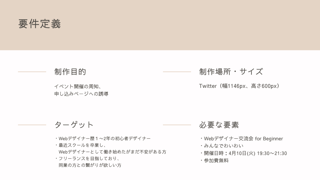 SHElikesの課題でWEBデザイナー交流会のイベントバナーを作成しました。要件定義、情報設計やデザインで工夫した点、制作を通して学んだことをまとめています。2021年8月