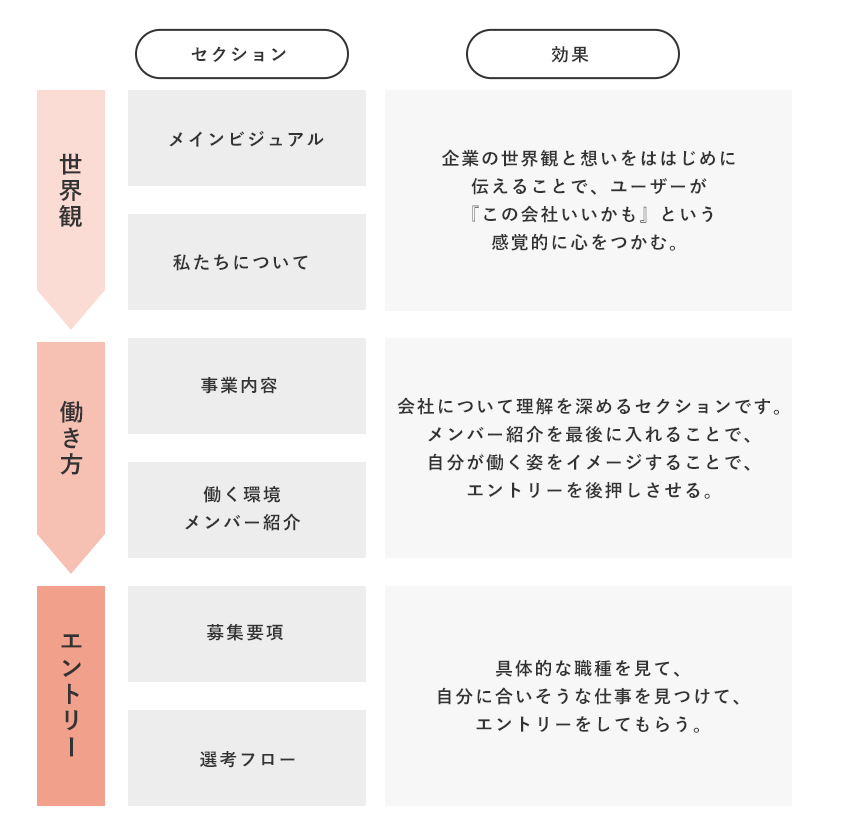 ユーザーに伝えたい情報を『世界観』『働き方』『エントリー』に分けて、ストーリー立てて設計しました。特にメインビジュアルとコンセプトのセクションで、ユーザーを惹き付けることで、サイトを見続けてもらえると思い重要視しました。