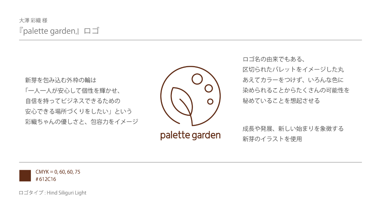 【実案件】palette garden様 ロゴ Yasuko Noda 複業デザイナー OVERVIEW オンラインコミュニティ「palette garden」のロゴを制作しました。[制作期間:4週間|制作時間:20時間|使用ツール:Illustrator] YEAR 2024
