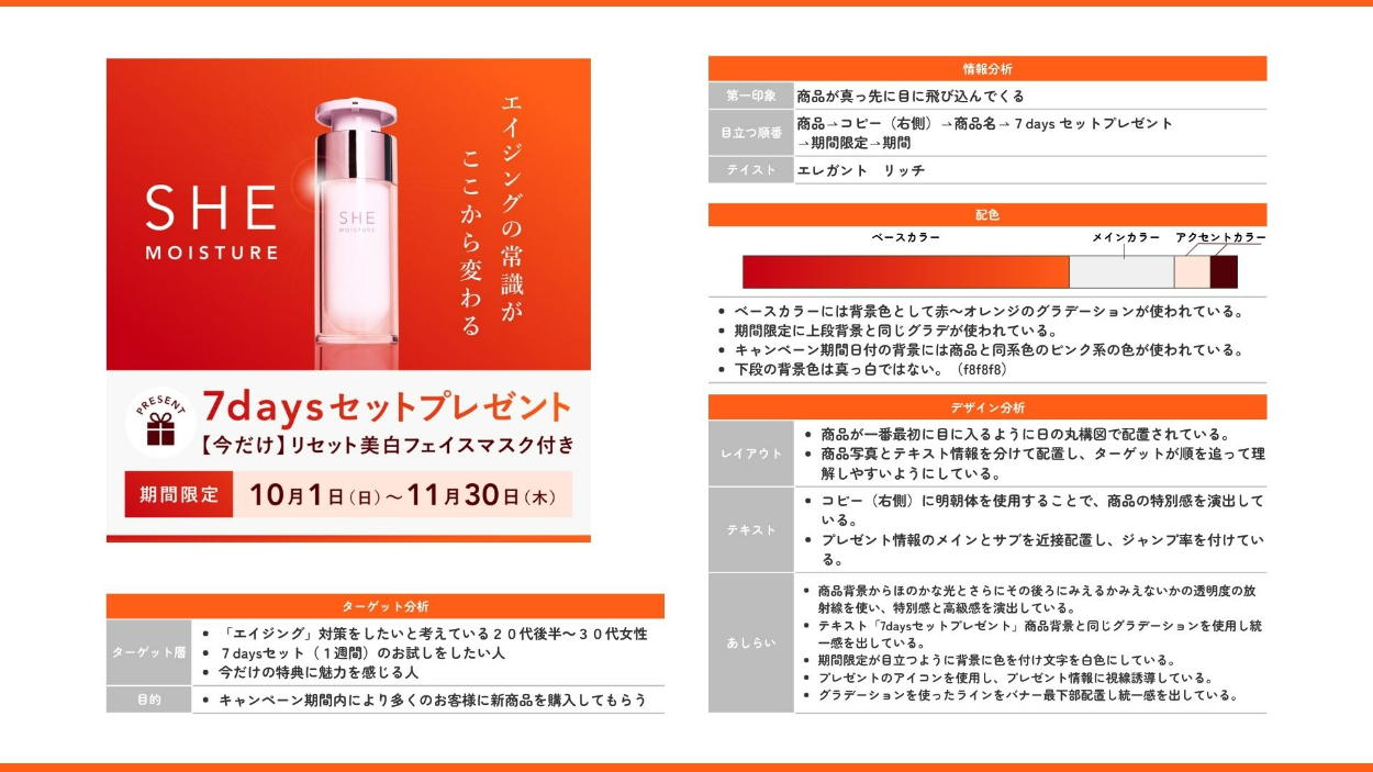 閲覧・分析・制作では着目点が異なり、特に手を動かすことで初めて気づく設計意図や細部の工夫が多いと実感した。この経験から、今後は制作前の分析段階で「なぜこの表現か」をより意識して取り組みたい。フォントは「探すもの」ではなく「意図に合わせて選ぶもの」だと理解した