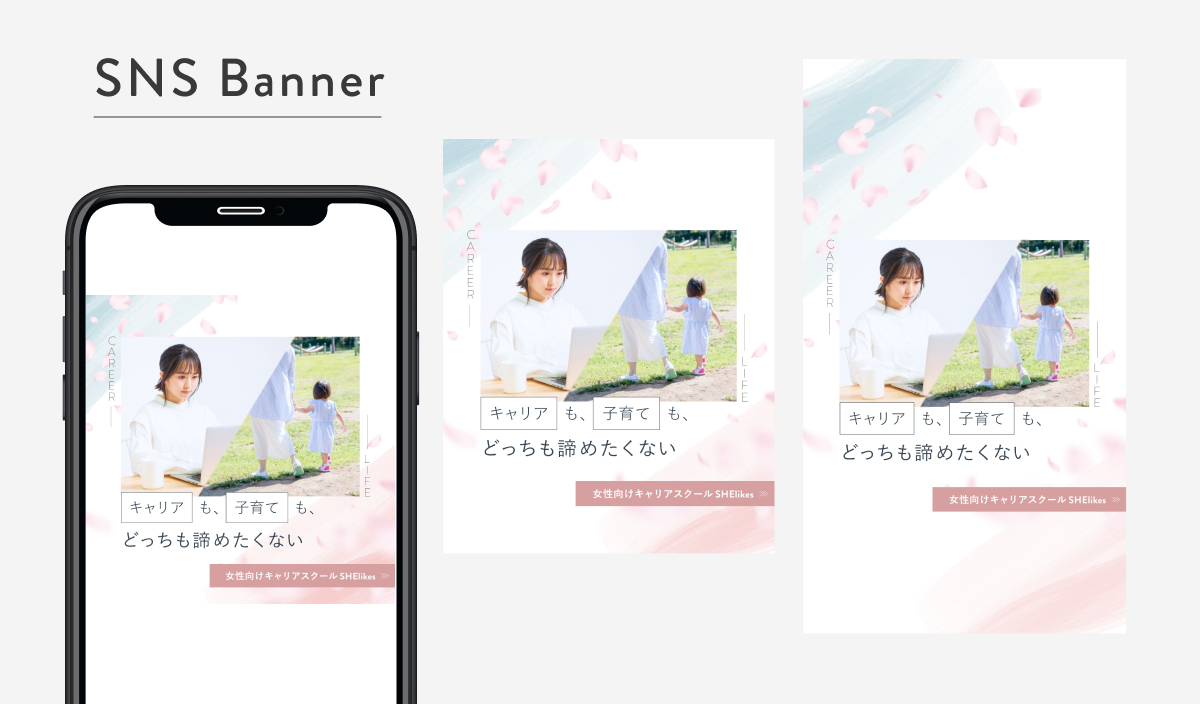 SHE株式会社様のサービス“SHElikes”のSNS広告バナー制作。 (マーケティングチームからの要件とラフ提供有) [ 制作時間:2~3時間程度/使用ツール:Figma ]