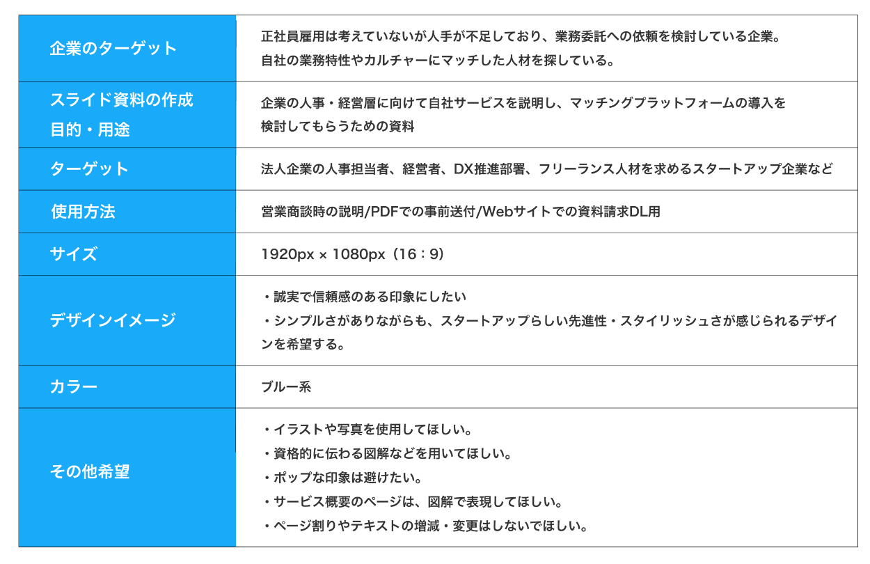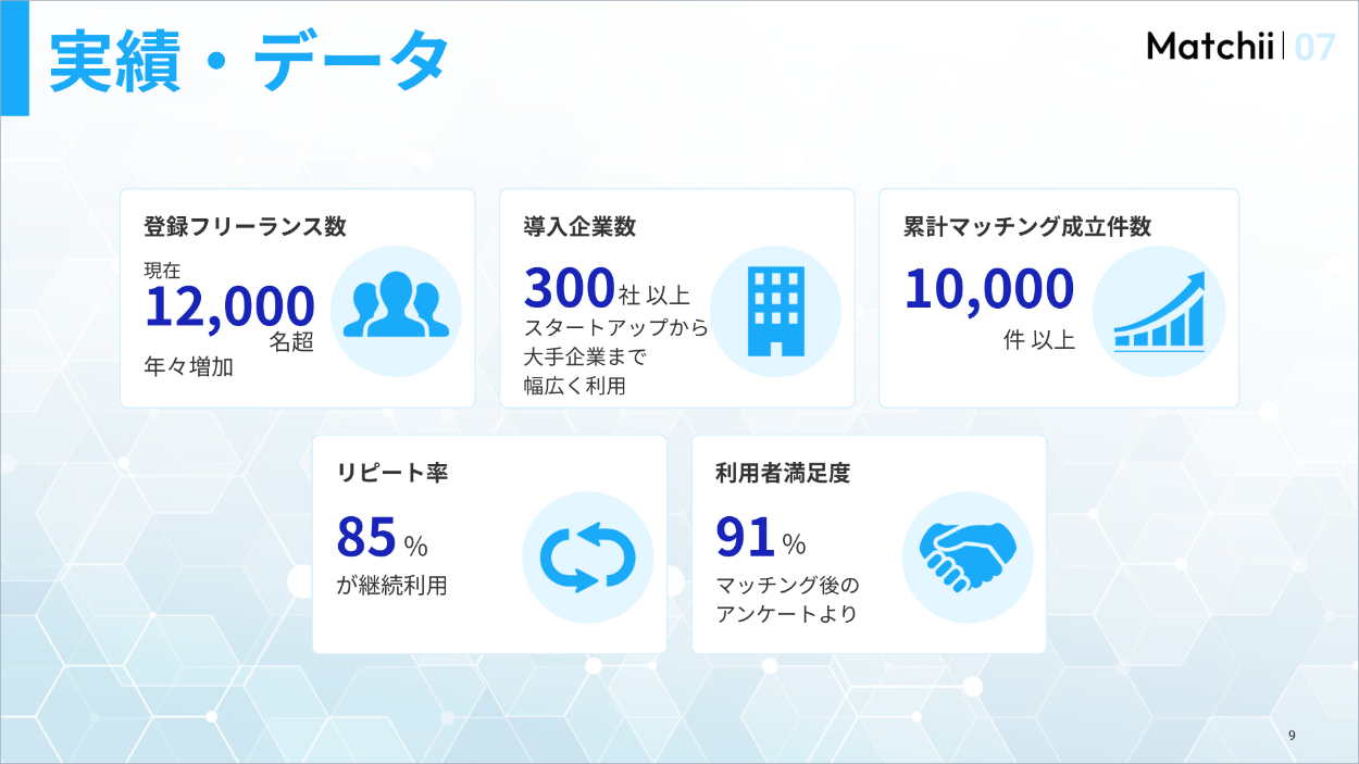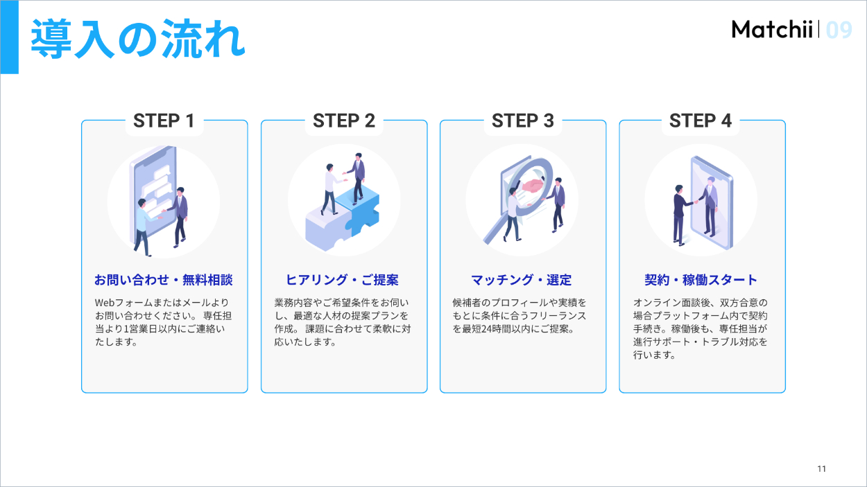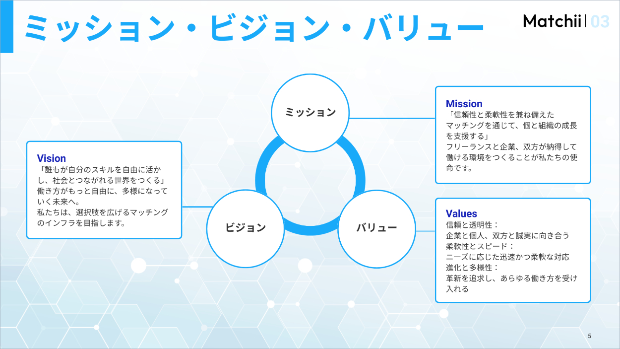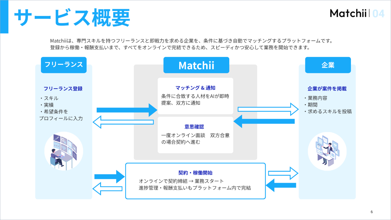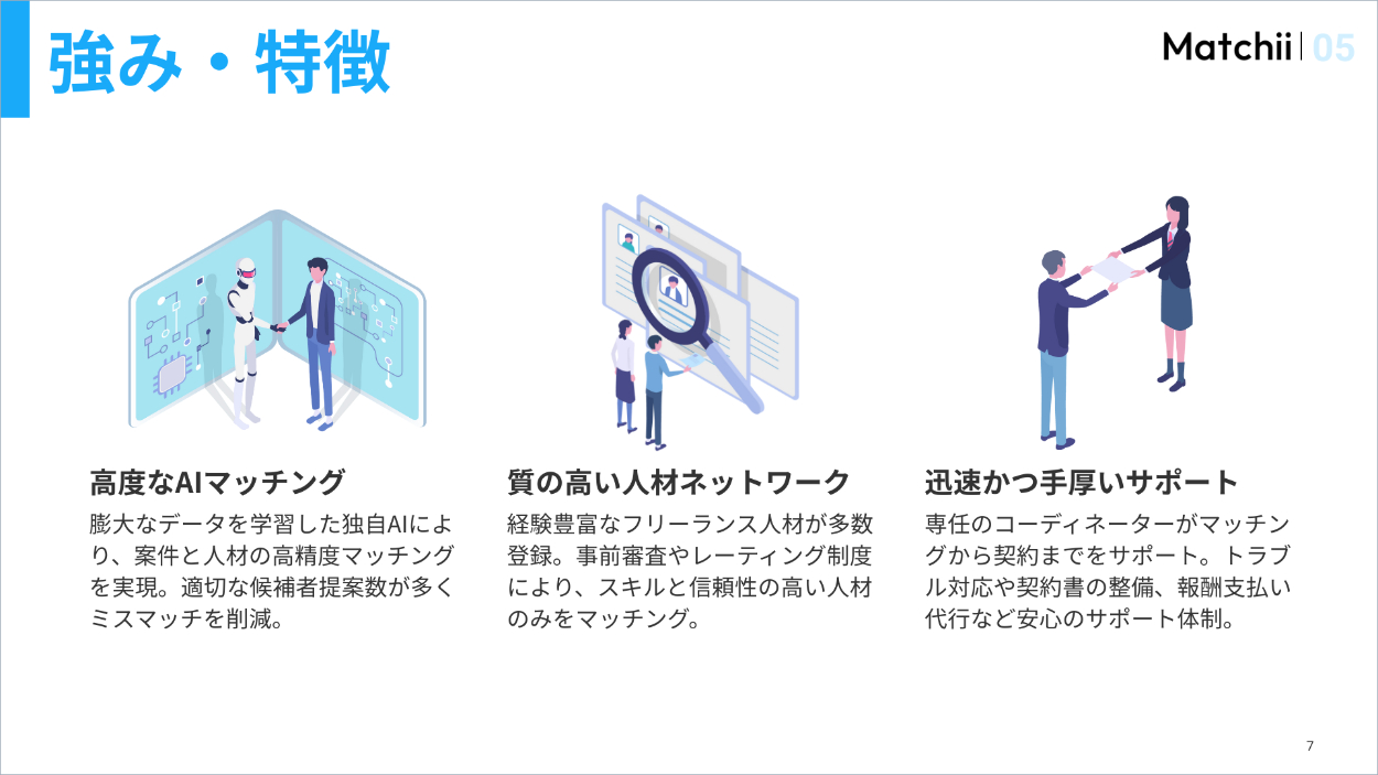 架空案件:フリーランス人材と企業をつなぐマッチングプラットフォームを運営する「Matchii」のスライド作成