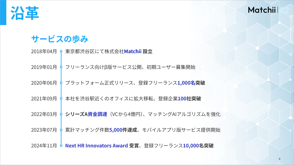 沿革部分は情報量が多くなりやすいため、Matchiiがこれまで歩んできた歴史や成長の流れが伝わるよう構成しました。