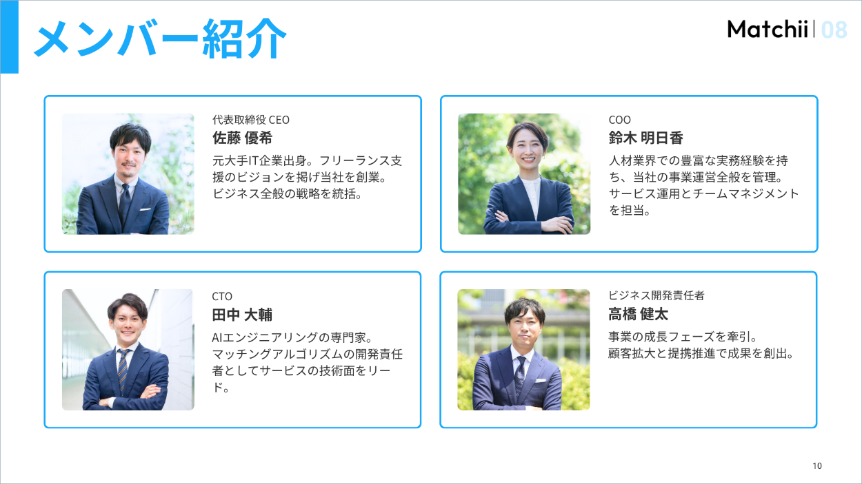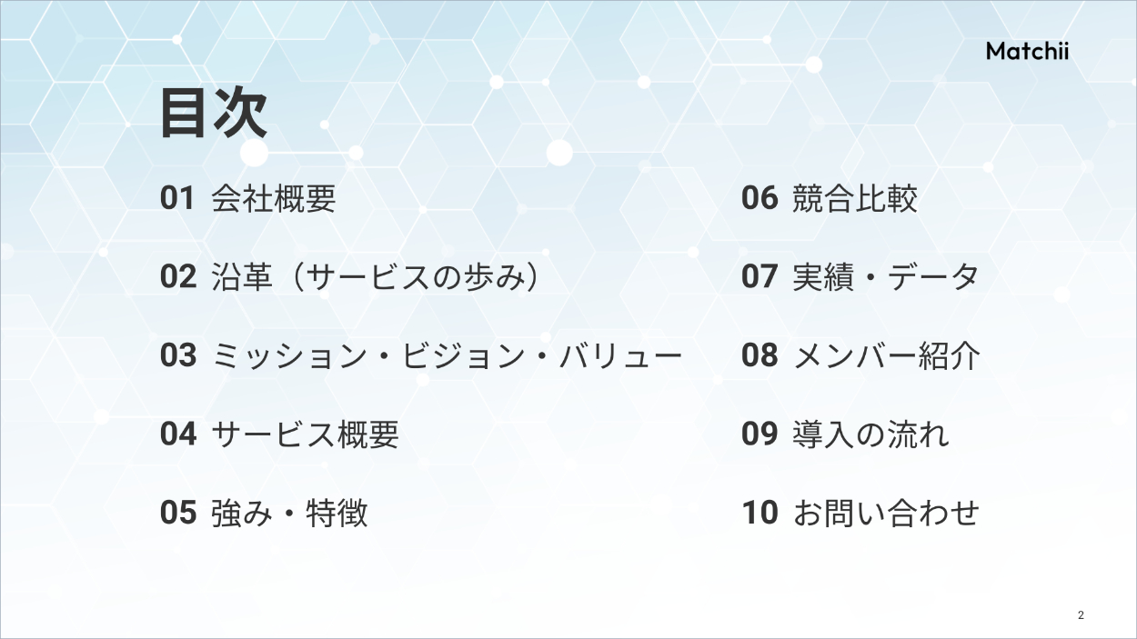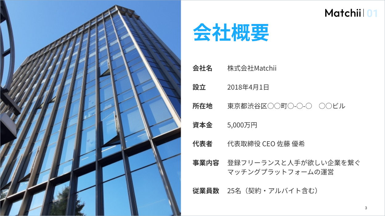 ▼右上にロゴとスライドナンバーを固定で配置し、全体のデザインに統一感を持たせました。また、Matchiiを身近に感じてもらえるよう、会社の外観写真を左半分に配置しています。