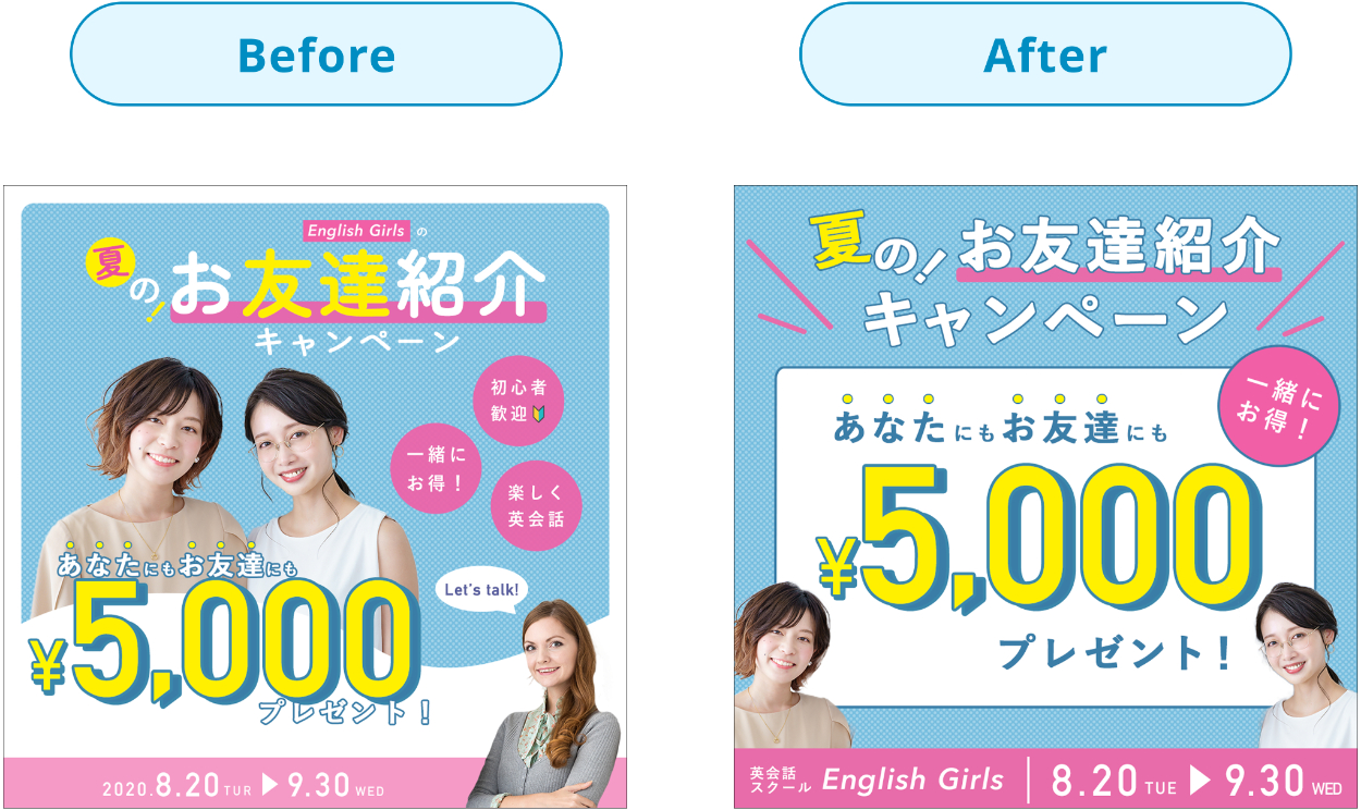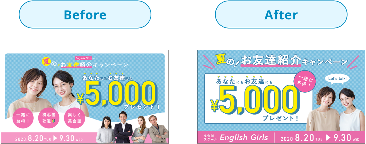 「友達」の写真と共にあることで、ごちゃごちゃして見える英語教師の写真をカット。その代わり、「English」の文字が入っているスクール名を大きく配置しました。また、「英会話スクール」の文言を追加して、情報の補強をしています。