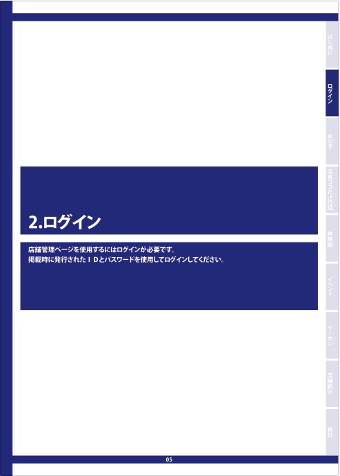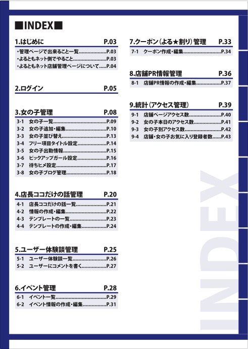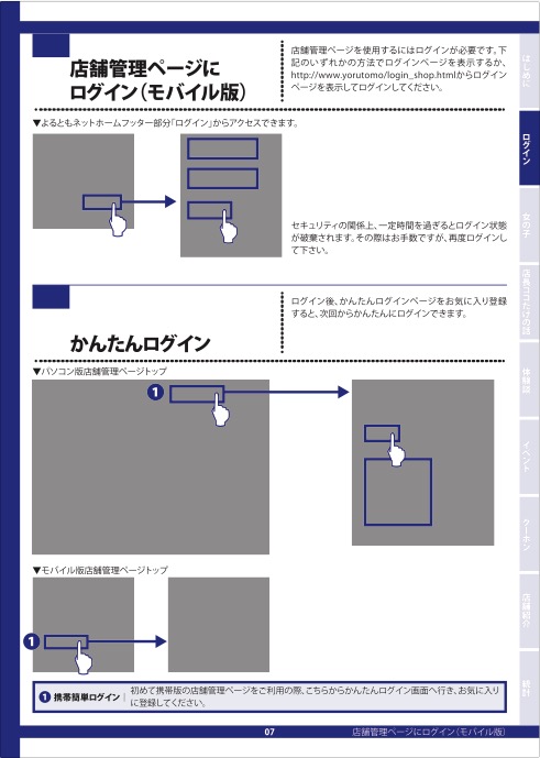 風俗店マニュアル・ランディングページ NKporforio デザイナー OVERVIEW 風俗店の紹介サイトリニューアルに伴い、利用者に新しくなったサイトの説明をランディングページで説明。店舗登録者にお渡しするマニュアルのデザインを作成。