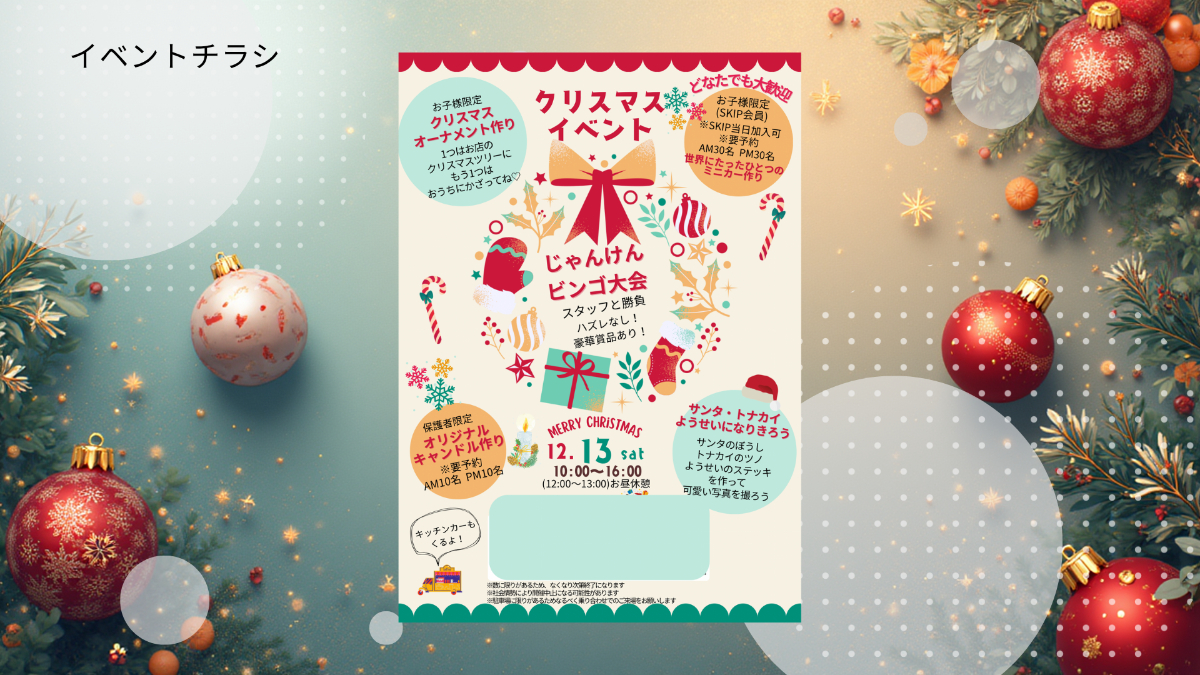 イベント情報の構成整理 → カラートーン設計(ベージュ×赤×グリーンでクリスマス感を演出)→ イラストと装飾でワクワク感を強調 → フォント選定(視認性の高い手書き風)→ 余白・レイアウトを調整し、にぎやかでも読みやすい印象に。