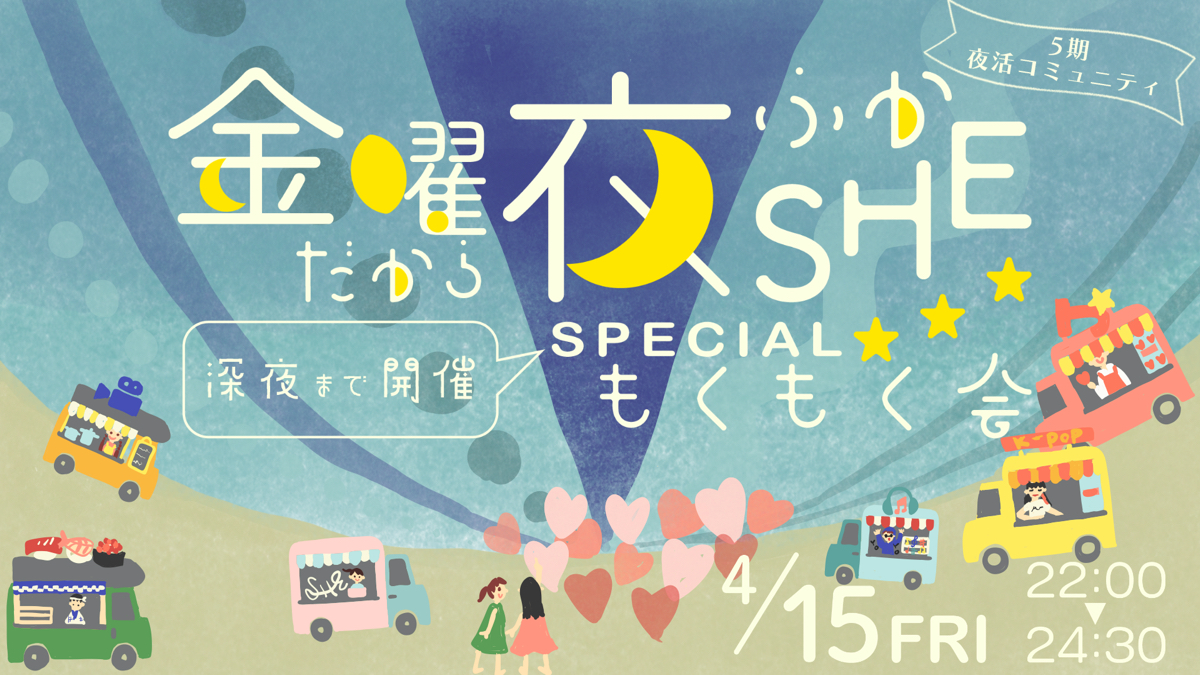 SHElikes夜活コミュニティ『金曜だから夜ふかSHE 深夜まで開催SPECIALもくもく会』イベント告知バナー