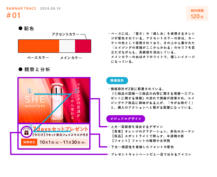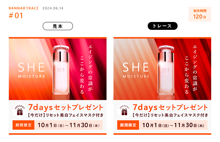 SHElikes MULTI CREATOR COURSEにてバナートレースの課題に取り組みました。ターゲットや目的を考察し、デザインを観察・分析しました。 (制作時間:120分 / 使用ツール:Photoshop)