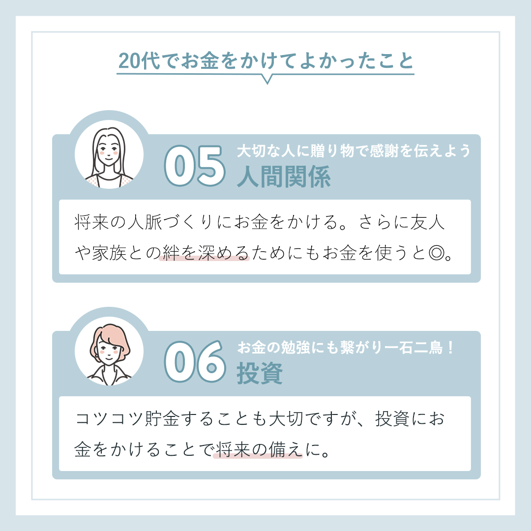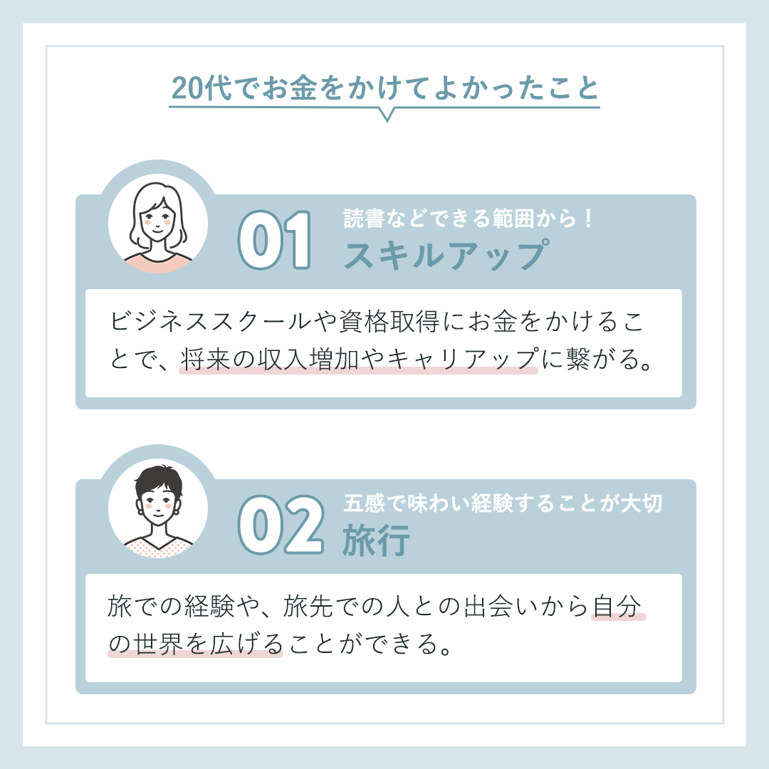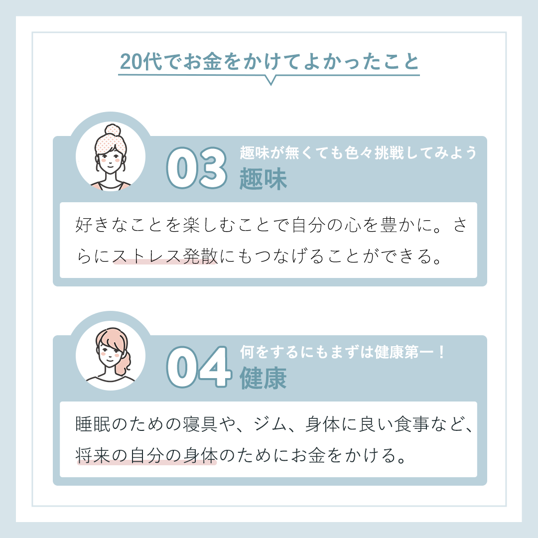 - 『30代が選ぶ』というテーマのため、30代(女性イラスト)が各々が思う『20代でお金をかけてよかったこと』を列挙しているようなデザインにしました。