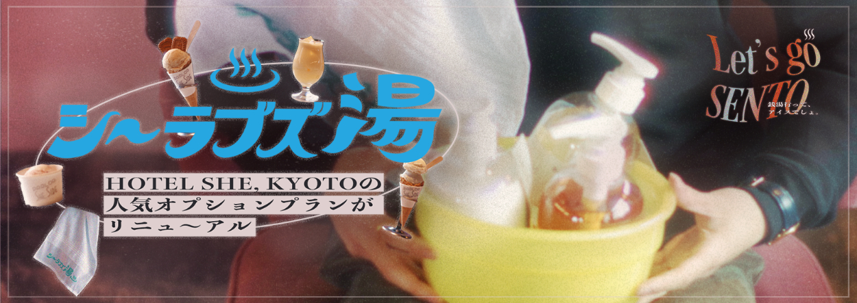 ①テキスト「HOTEL SHE, KYOTOの人気オプションプランがリニューアル」