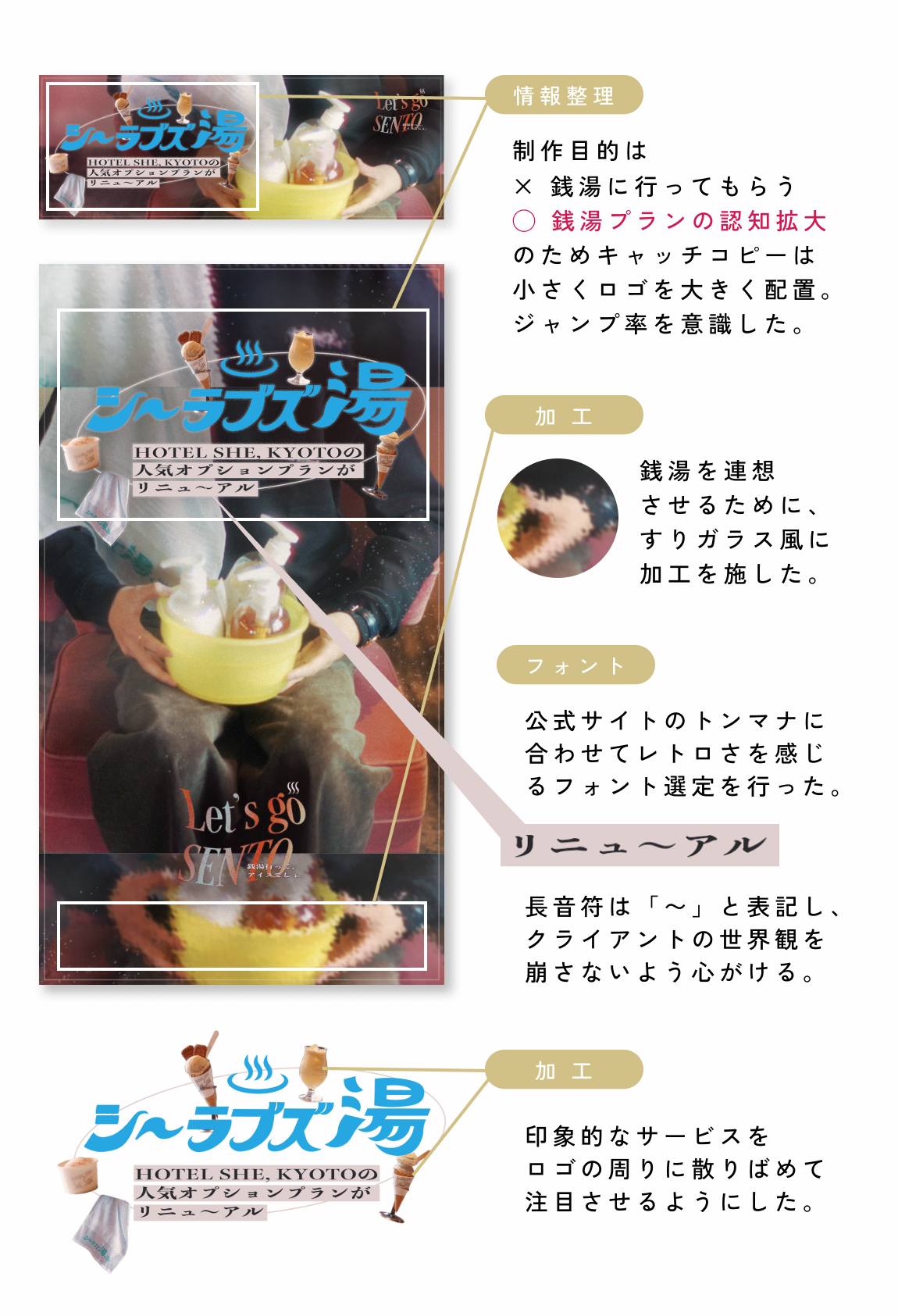 クライアントより写真素材・「シ〜ラブズ湯」のロゴをご提供いただきました。さまざまなバリエーションの写真素材の中より、「HOTEL SHE, KYOTO」「銭湯」ということがパッとわかるものをピックアップしました。